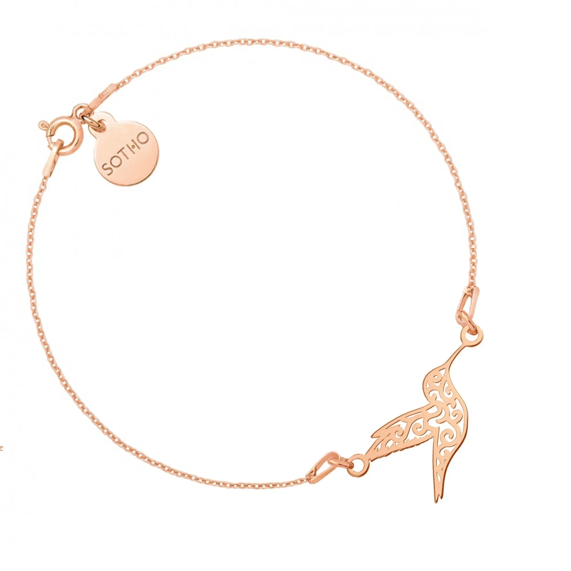 Srebrna bransoletka łańcuszkowa zdobiona ażurowym kolibrem i zawieszką z logo marki. Całość wykonana ze srebra 925.