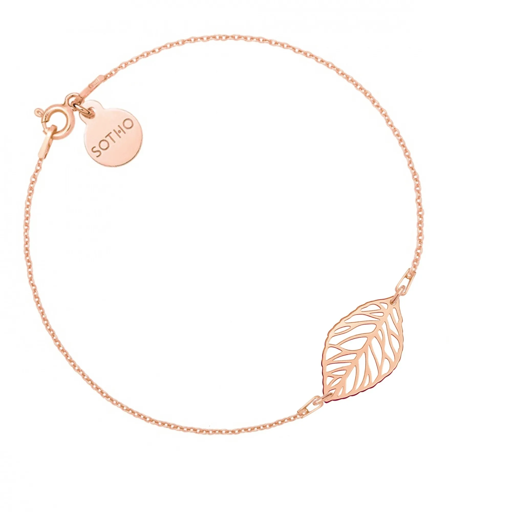 Srebrna bransoletka łańcuszkowa zdobiona ażurowym liściem i zawieszką z logo marki. Całość wykonana ze srebra 925.
