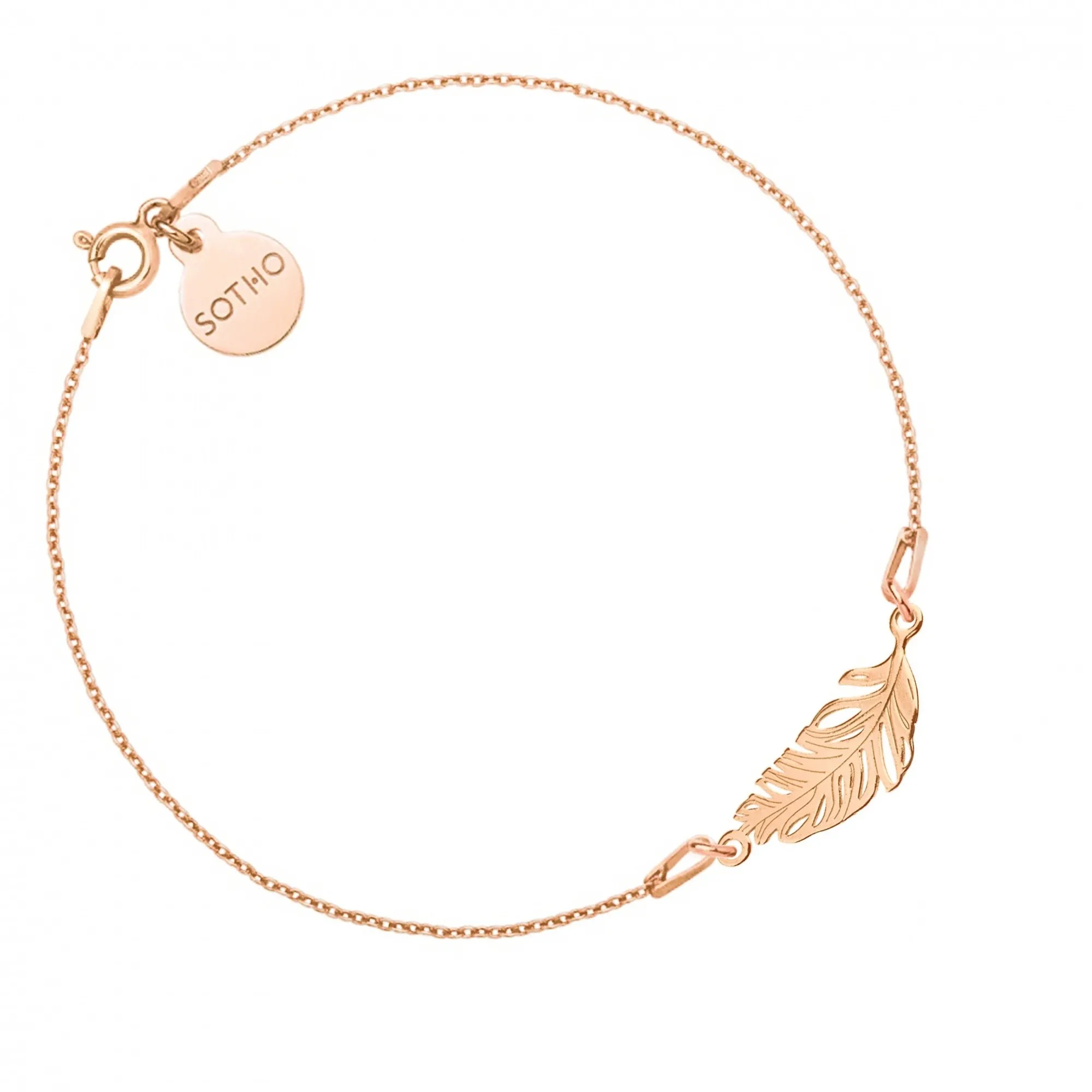 Srebrna łańcuszkowa bransoletka zdobiona piórkiem i zawieszką z logo marki. Całość wykonana ze srebra 925.