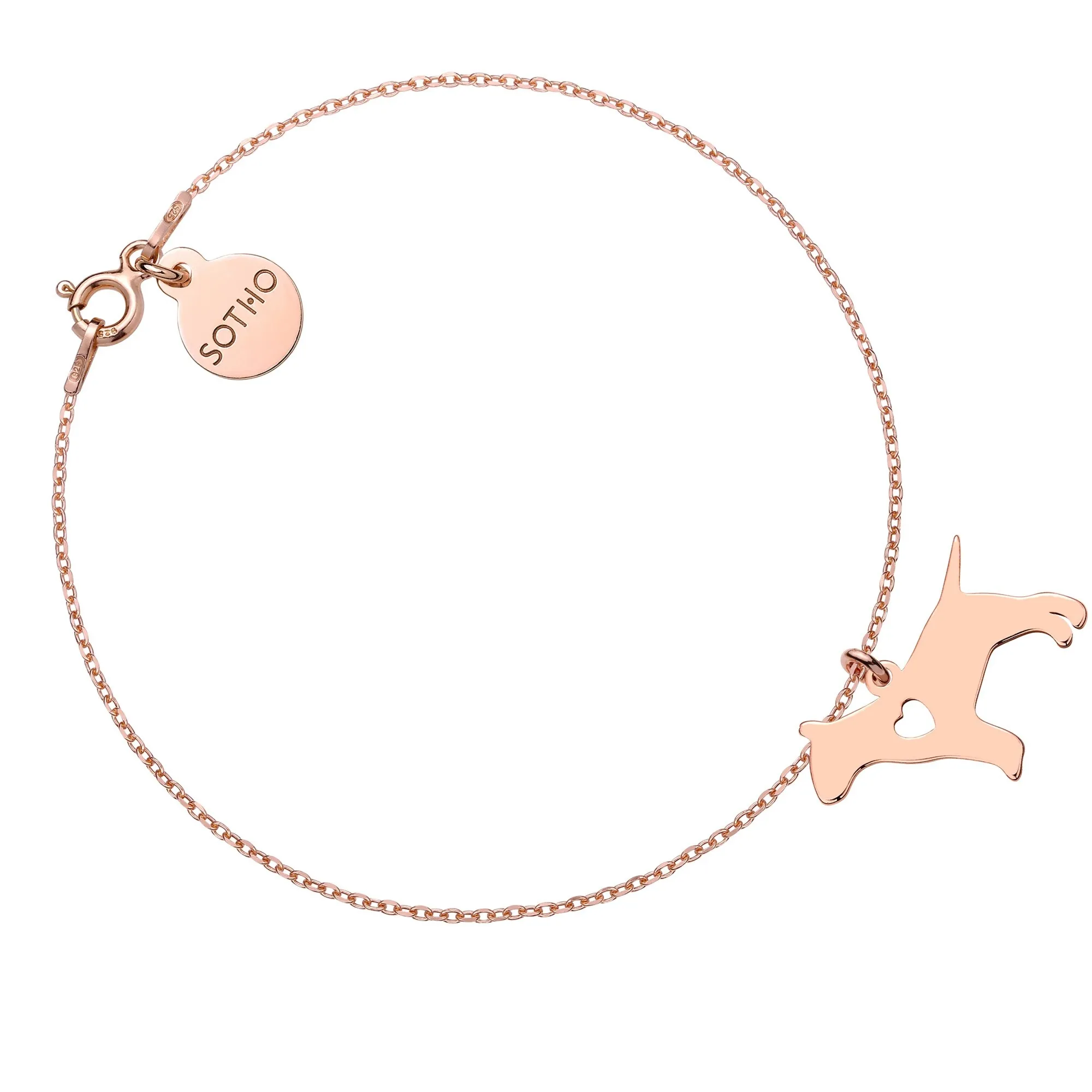 Srebrna bransoletka łańcuszkowa zdobiona zawieszką z psem rasy bulterier i zawieszką z logo marki. Całość wykonana ze srebra 925. Długość bransoletki 18 cm. Grubość łańcuszka 1 mm. Pies 20 x 17 mm. Zawieszka z logo 10 mm. Produkt o wadze poniżej 5 g. Zapakowany w eleganckie pudełeczko z logo marki. Posiada logowaną metkę. Istnieje możliwość zamówienia bransoletki innej długości, z innym modelem zawieszki, z kilkoma zawieszkami, na innym modelu łańcuszka, w wersji ze srebra 925 powlekanego 24 karatowym żółtym lub różowym złotem itp.