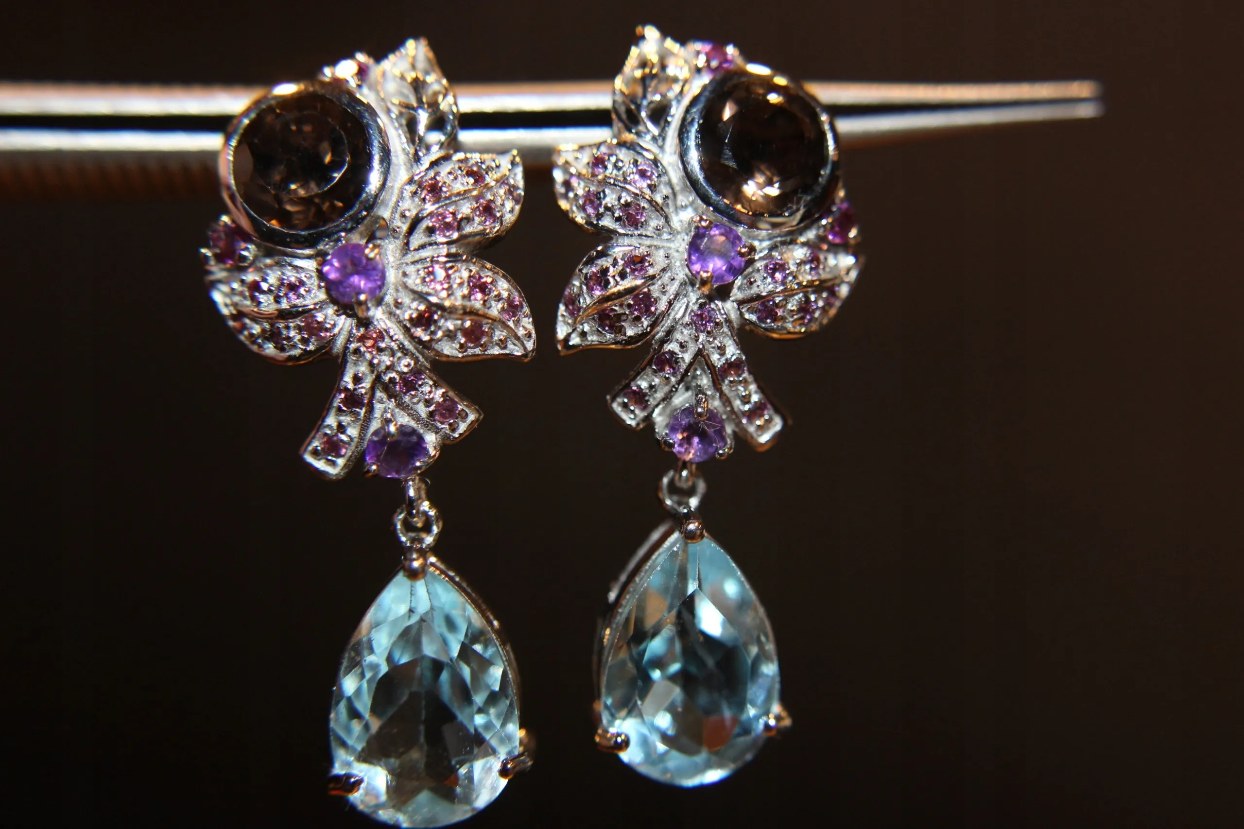 Witamy, Mam do sprzedania nową (bez metki), pozłacaną 14K białym złotem, srebrną – próba 925 broszkę z naturalnymi granatami (rodolitami), tanzanitami, szmaragdami i szafirami Songea paparadża. Waga całkowita (kamienie+srebro): 10.35 g Wymiary: 38 x 33 mm Pochodzenie: Brazylia Polecam, broszka jest cudowna :).