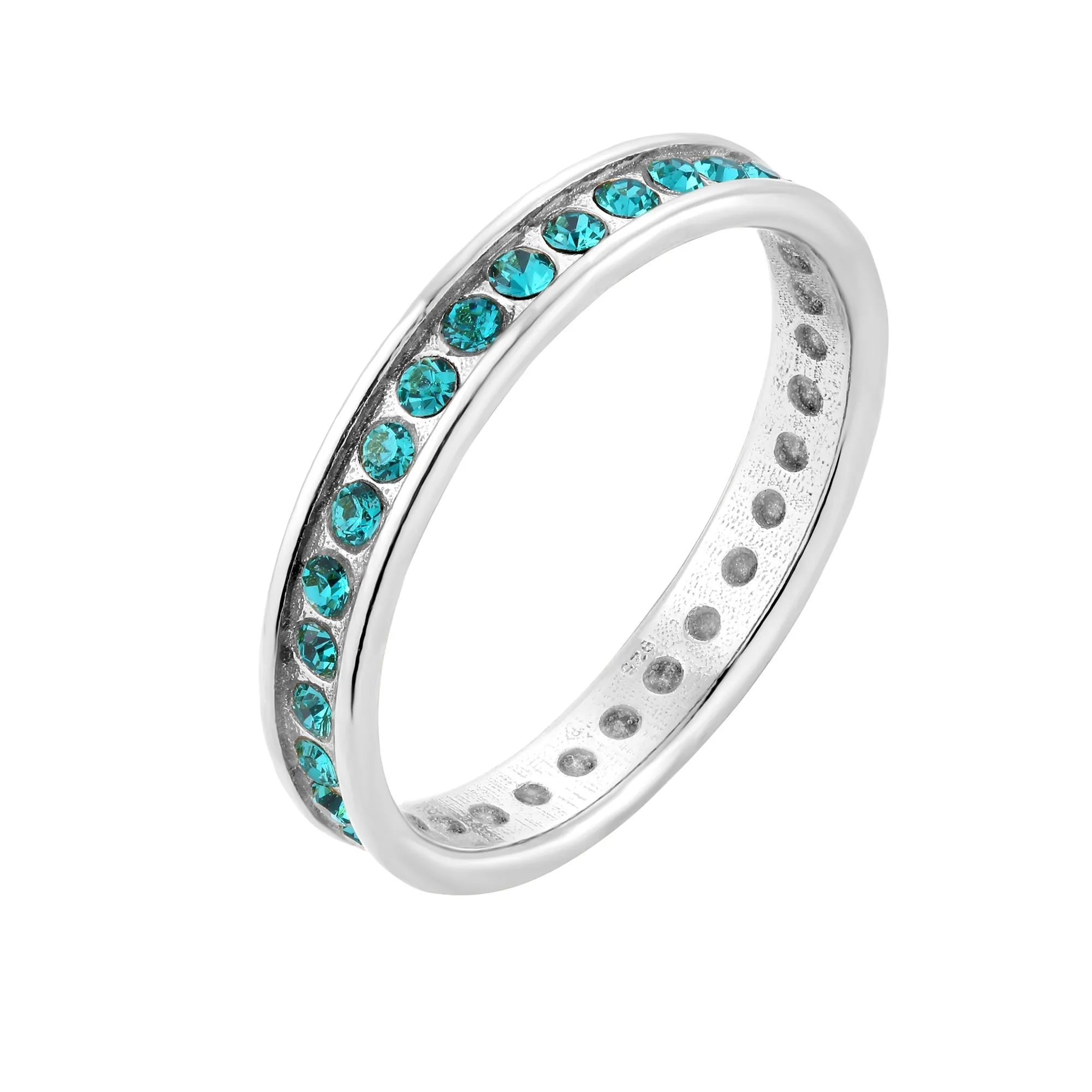 Srebrna obrączka z kryształami Preciosa w kolorze turkusowym Blue Zircon. Wykonana ze srebra 925. Obrączka w rozmiarach 10, 12, 14, 16, 18 Szerokość obrączki 3,3 mm Kryształ 1,5 mm Produkt o wadze poniżej 5 g. Zapakowany w eleganckie pudełeczko z logo marki. Posiada logowana metkę. Istnieje możliwość zamówienia pierścionka z innym kolorem kryształów, w wersji ze srebra 925 powlekanego 24 karatowym żółtym lub różowym złotem.