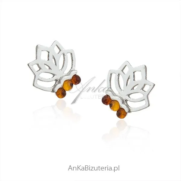 Kolczyki srebrne z bursztynem kwiat lotosu