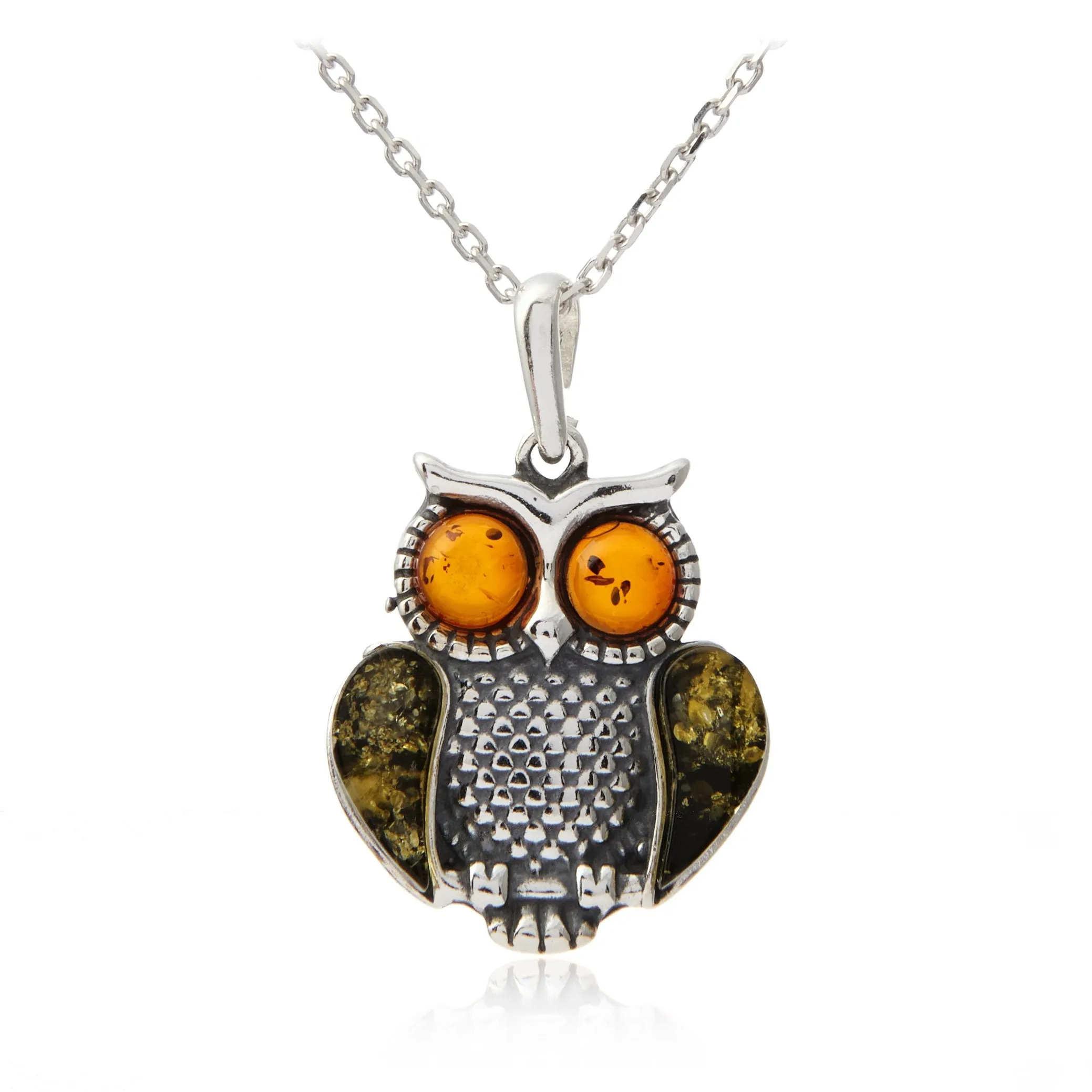 Zawieszka srebrna sówka z bursztynem - koniak i zielony