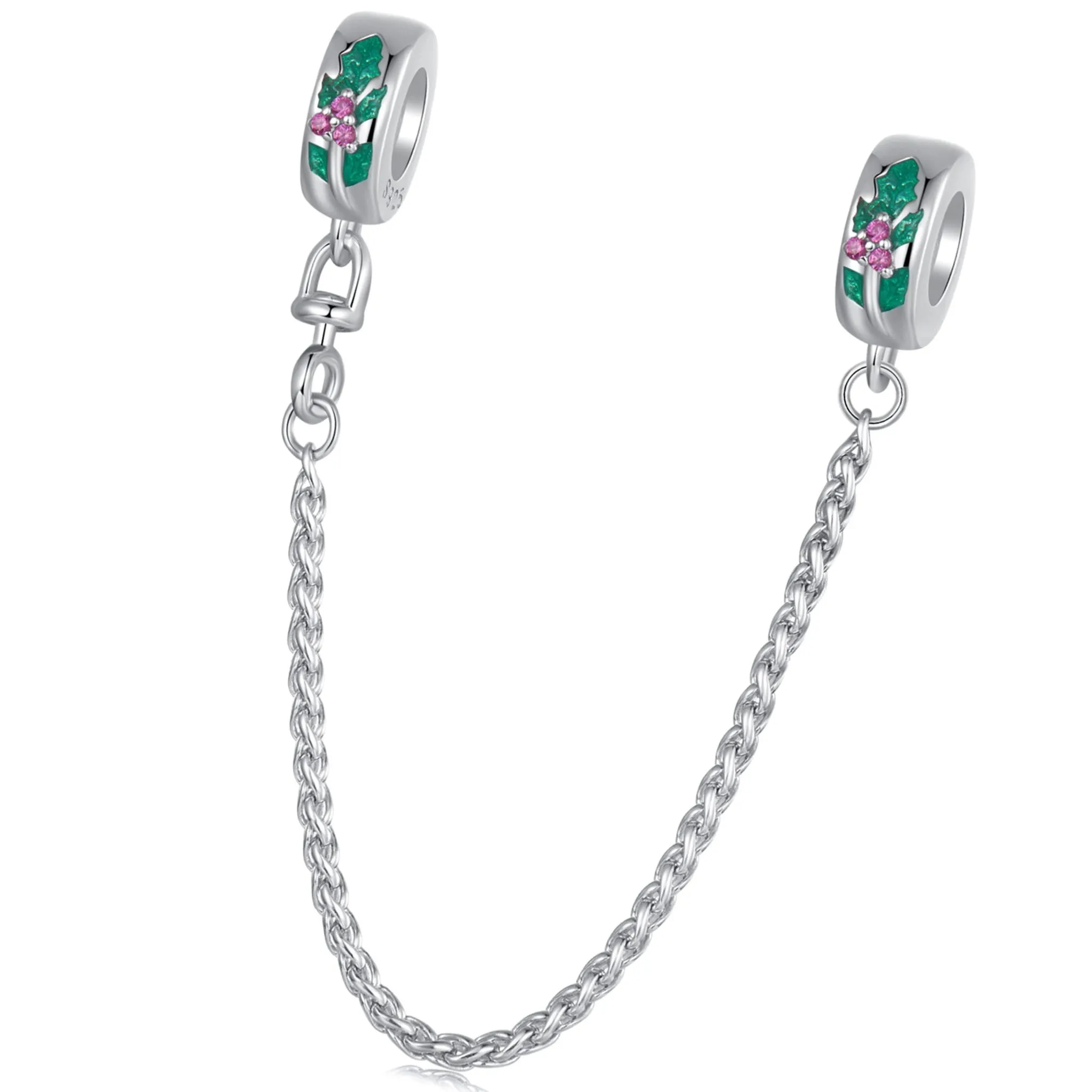 Łańcuszek zabezpieczający podwójny stoper ozdobiony listkami jemioły charms srebro 925