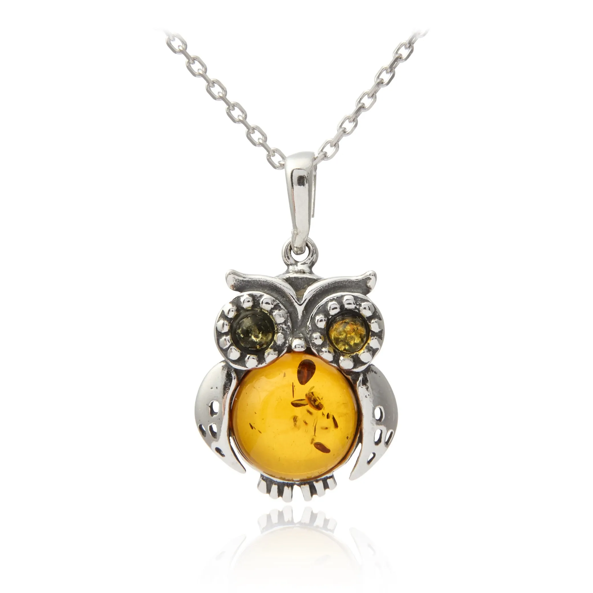 Srebrna zawieszka sówka z koniakowo - zielonym bursztynem