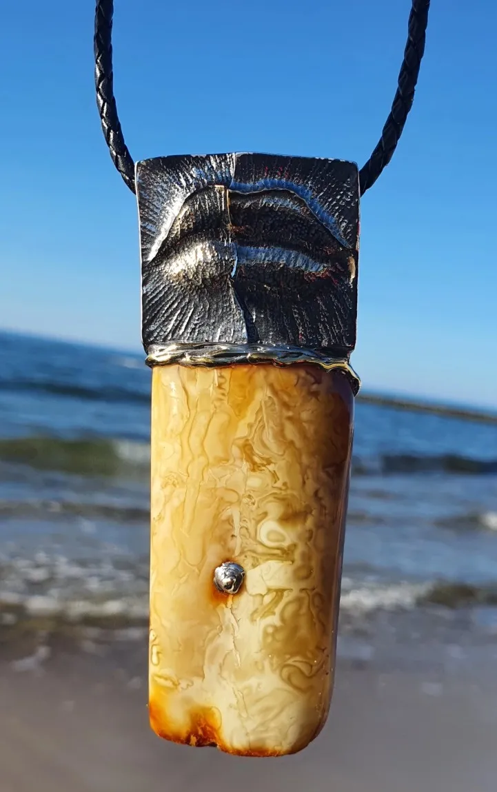 Unika towa biżuteria - piękna zawieszka srebrna z naturalnym bursztynem usta