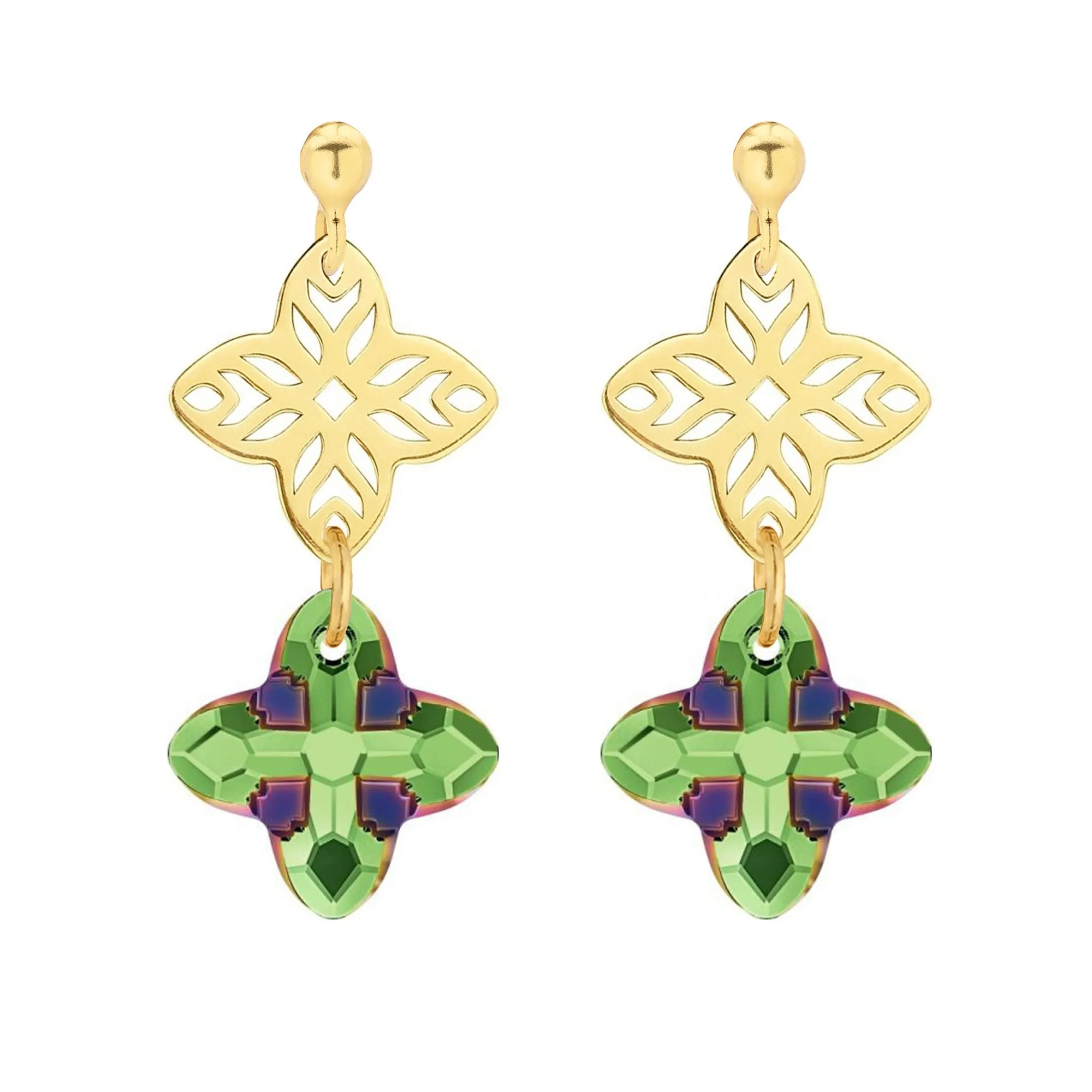 Złote kolczyki z rozetką i kryształem SWAROVSKI® CRYSTAL w kolorze zielonym