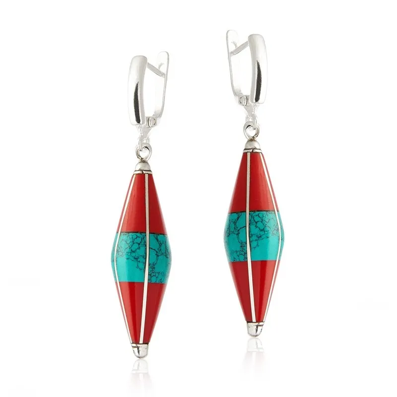 Srebrne kolczyki „coral turquoise harmony” – wiszące romby z koralem i turkusem