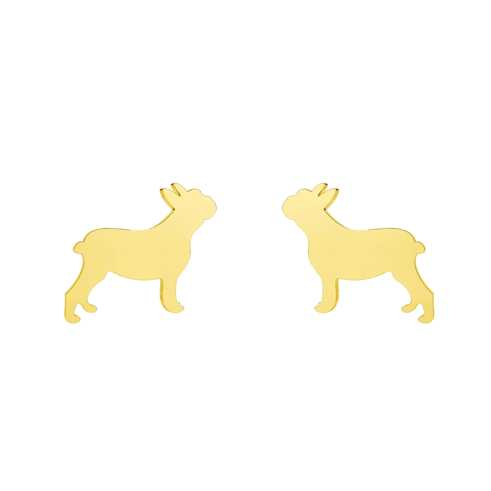 Srebrne kolczyki w kształcie jeleni. Zapinane na sztyft. Kolczyki posiadają zapięcia (baranki). Kolczyki w całości wykonane są ze srebra 925 powlekanego 24 karatowym żółtym złotem.