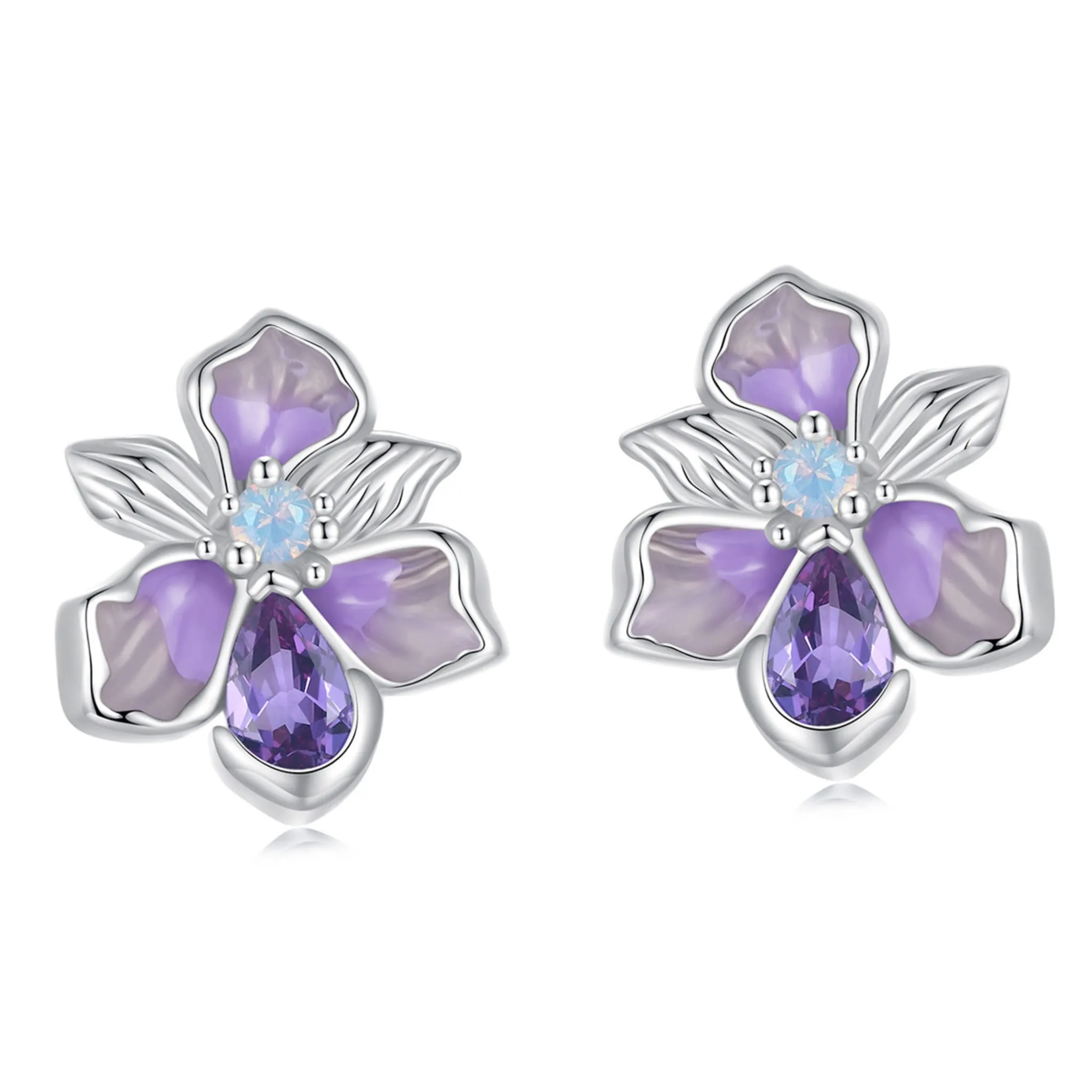 Srebrne kolczyki fioletowe kwiaty irysy sztyfty srebro 925