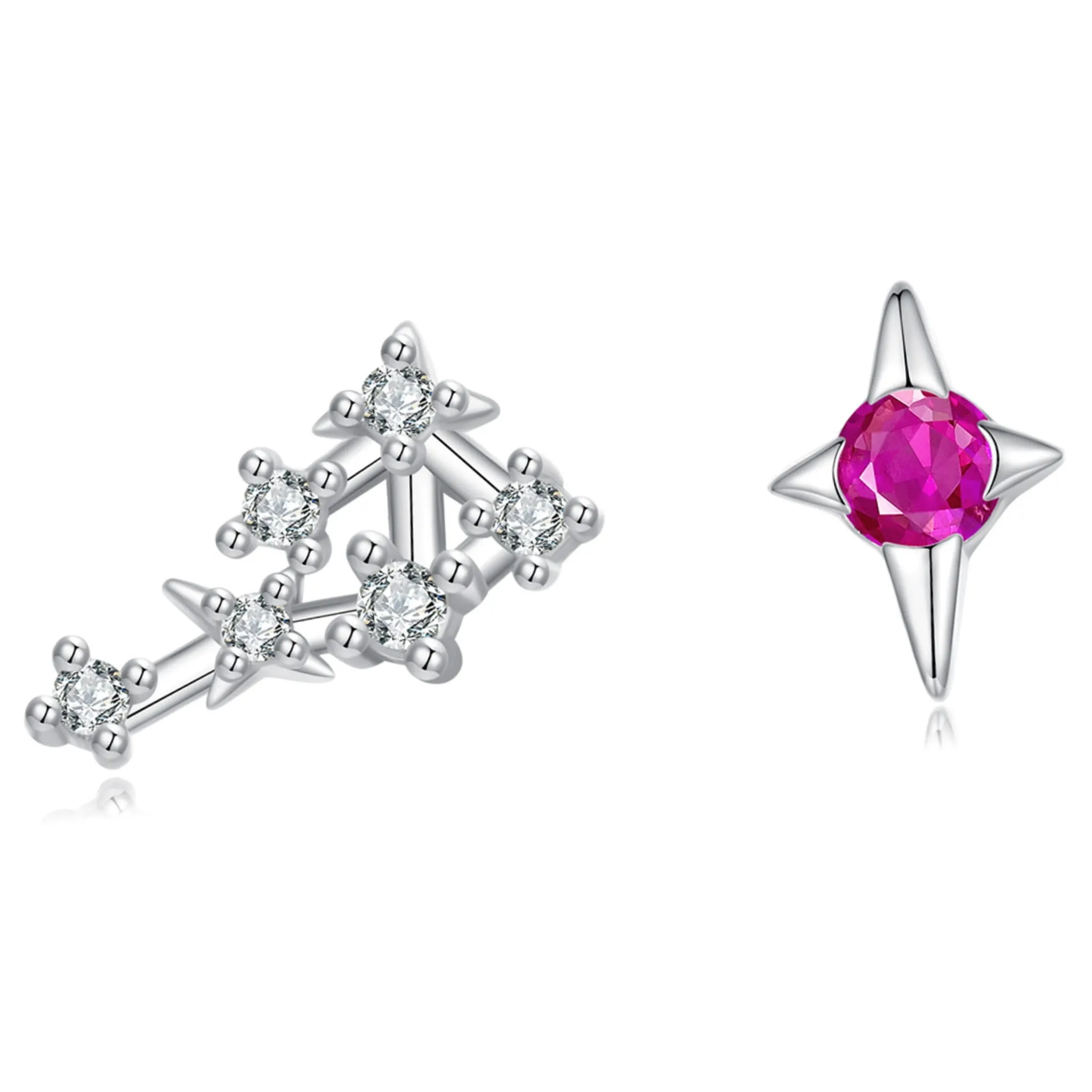 Srebrne kolczyki konstelacja Wagi i fuksjowa gwiazdka sztyfty srebro 925