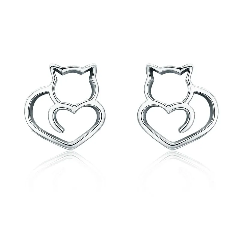 Kolczyki srebro 925 KOTKI z sercem sztyfty dla miłośniczek kotów