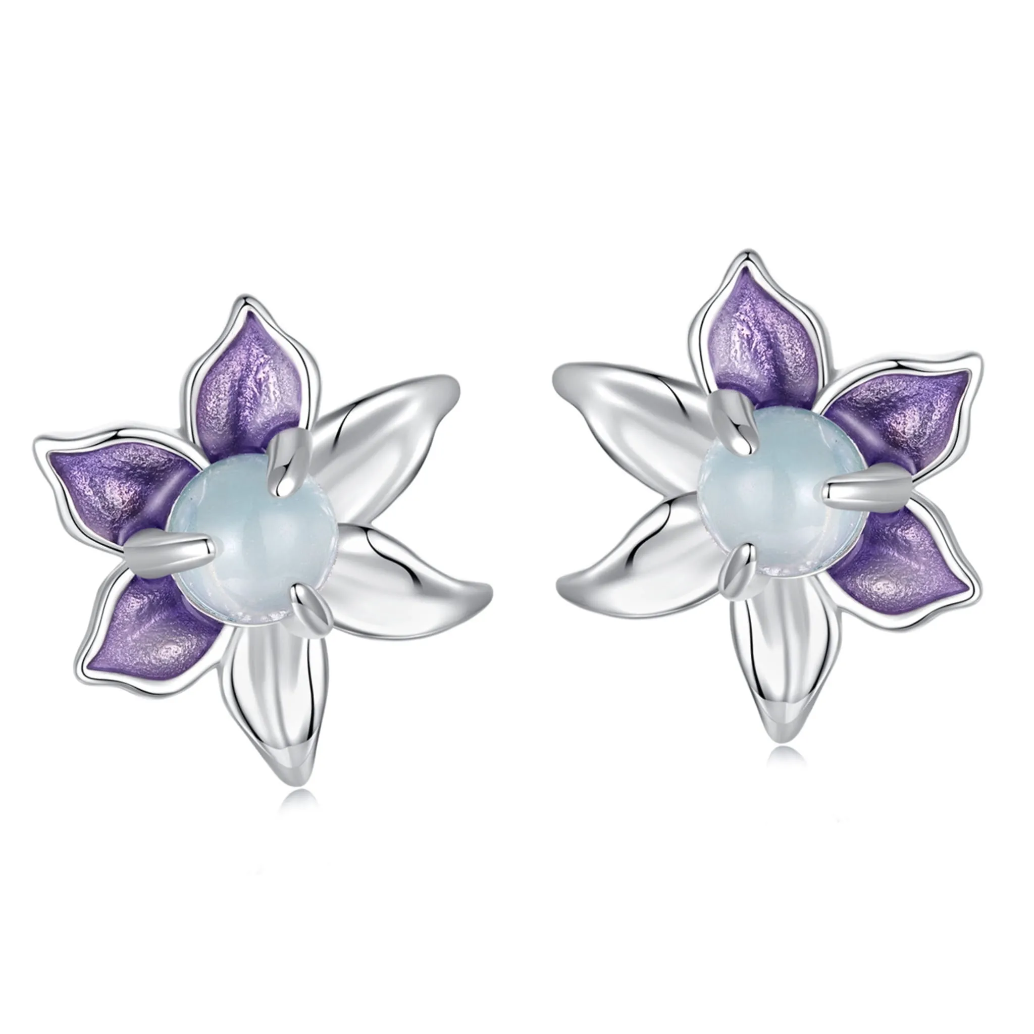 Srebrne kolczyki fioletowe kwiatki z opalizującymi kryształkami sztyfty srebro 925
