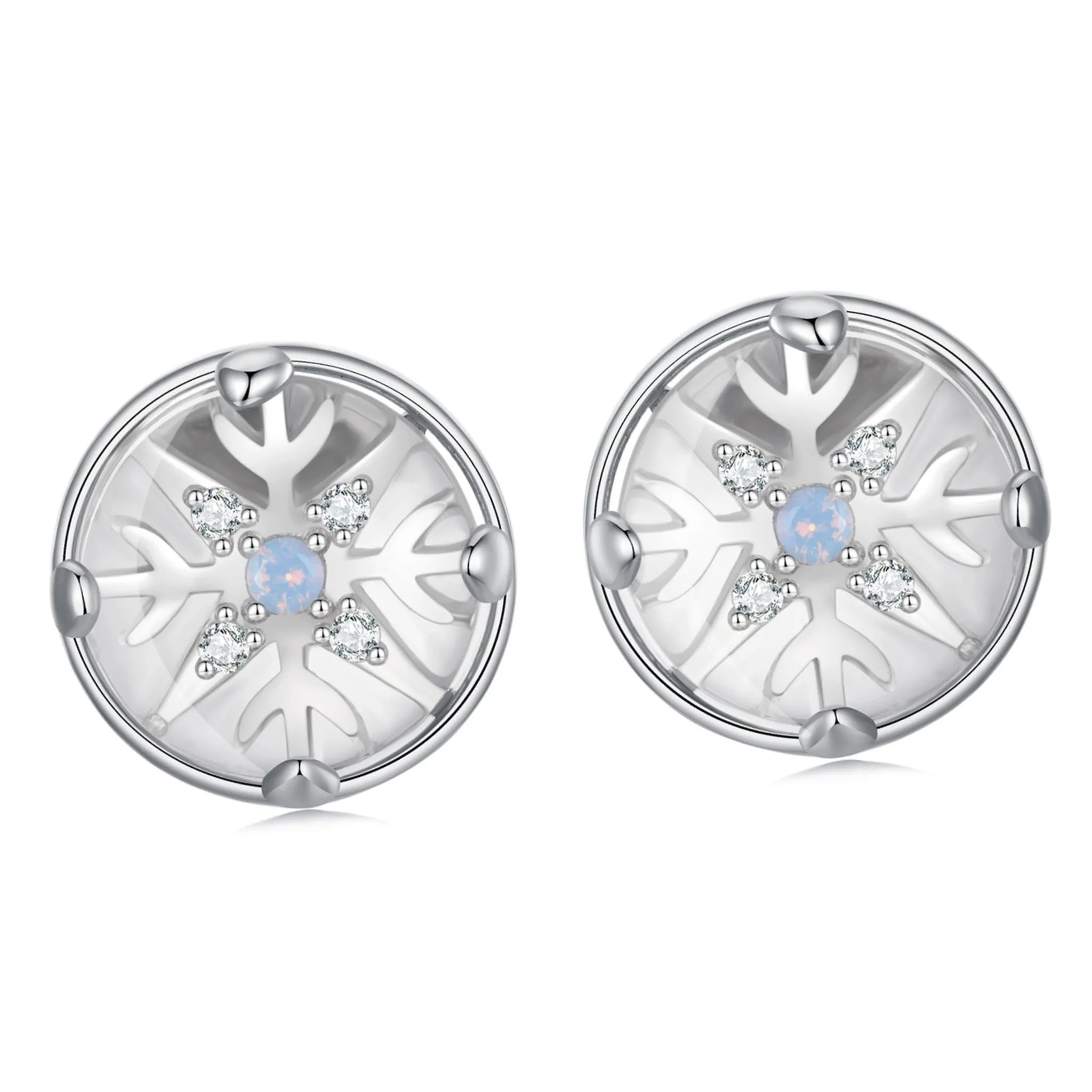 Srebrne kolczyki śnieżynki z opalizującymi kryształkami sztyfty srebro 925