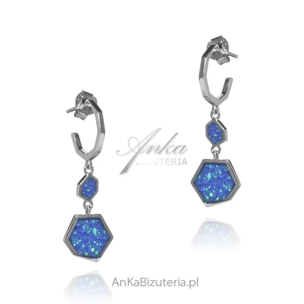 Kolczyki srebrne z niebieskim opalem - plastry miodu