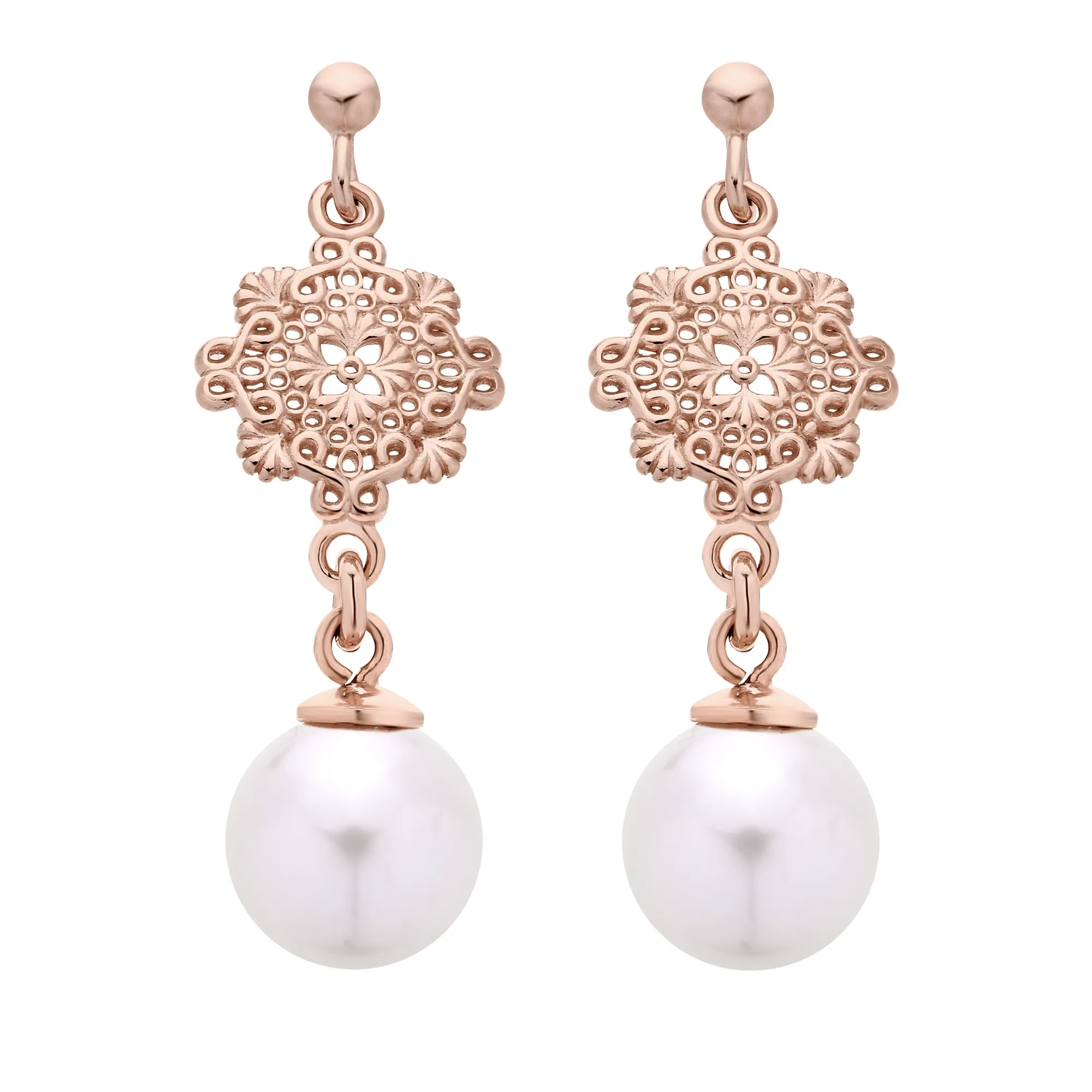 Srebrne kolczyki z rozetką i perłą SWAROVSKI® CRYSTAL. Całość wykonana ze srebra 925. Zapinane na sztyft. Kolczyki posiadają zapięcia (baranki). Rozetka 17 x 11 mm Perła 8 mmDługość całkowita ok 3,5 cm Produkt o wadze poniżej 5 g. Zapakowane w eleganckie pudełeczko z logo marki. Posiadają logowaną metkę. Istnieje możliwość zamówienia kolczyków z innym modelem lub kolorem pereł, z kilkoma perłami lub zawieszkami, na innych modelach bigli, na sztyftach, klipsach, w wersji srebra 925 powlekanego 24 karatowym różowym lub żółtym złotem, dodatkowymi kamieniami lub kryształami SWAROVSKI® CRYSTAL itp.