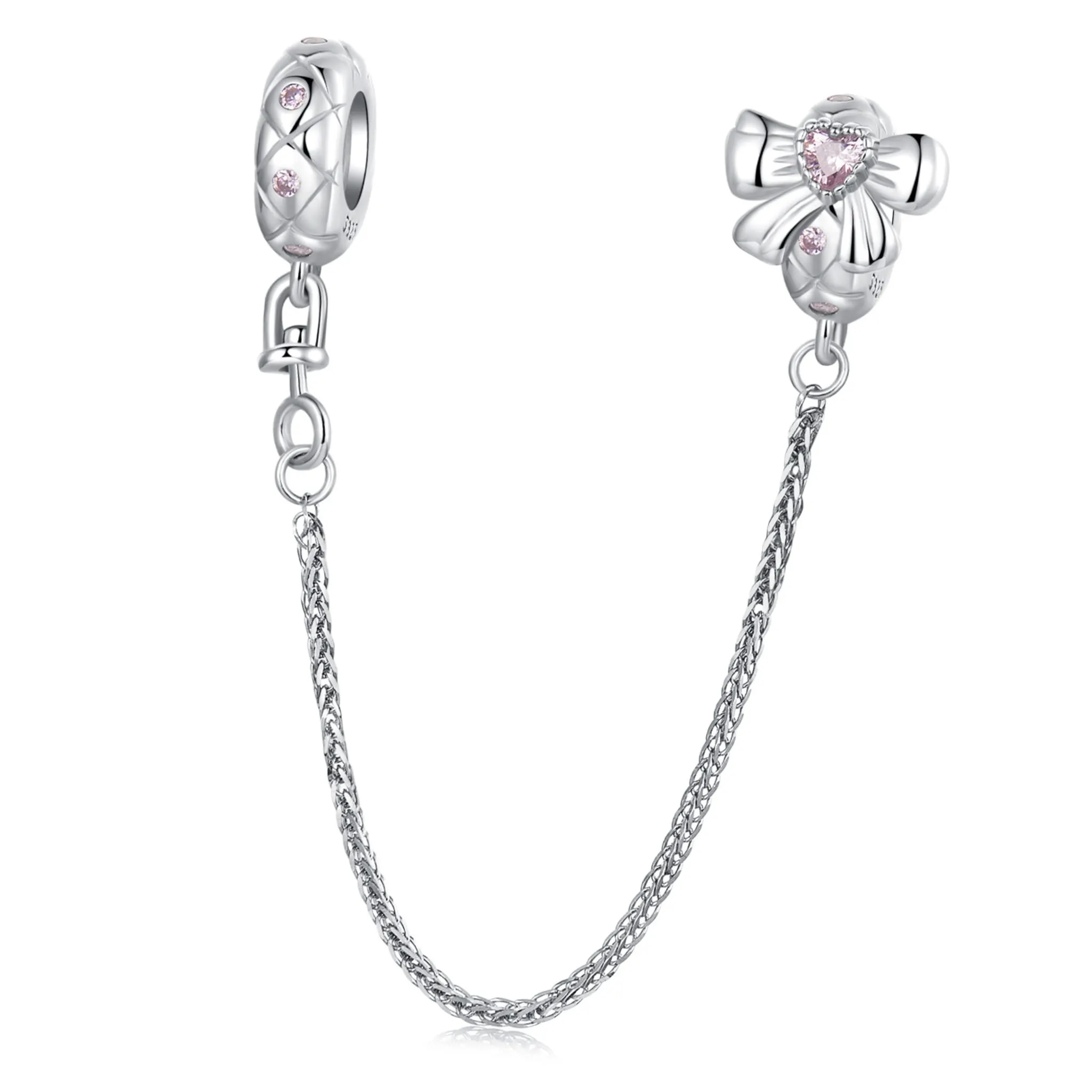 Łańcuszek zabezpieczający podwójny stoper ozdobiony kokardką i różowymi kryształkami charms srebro 925