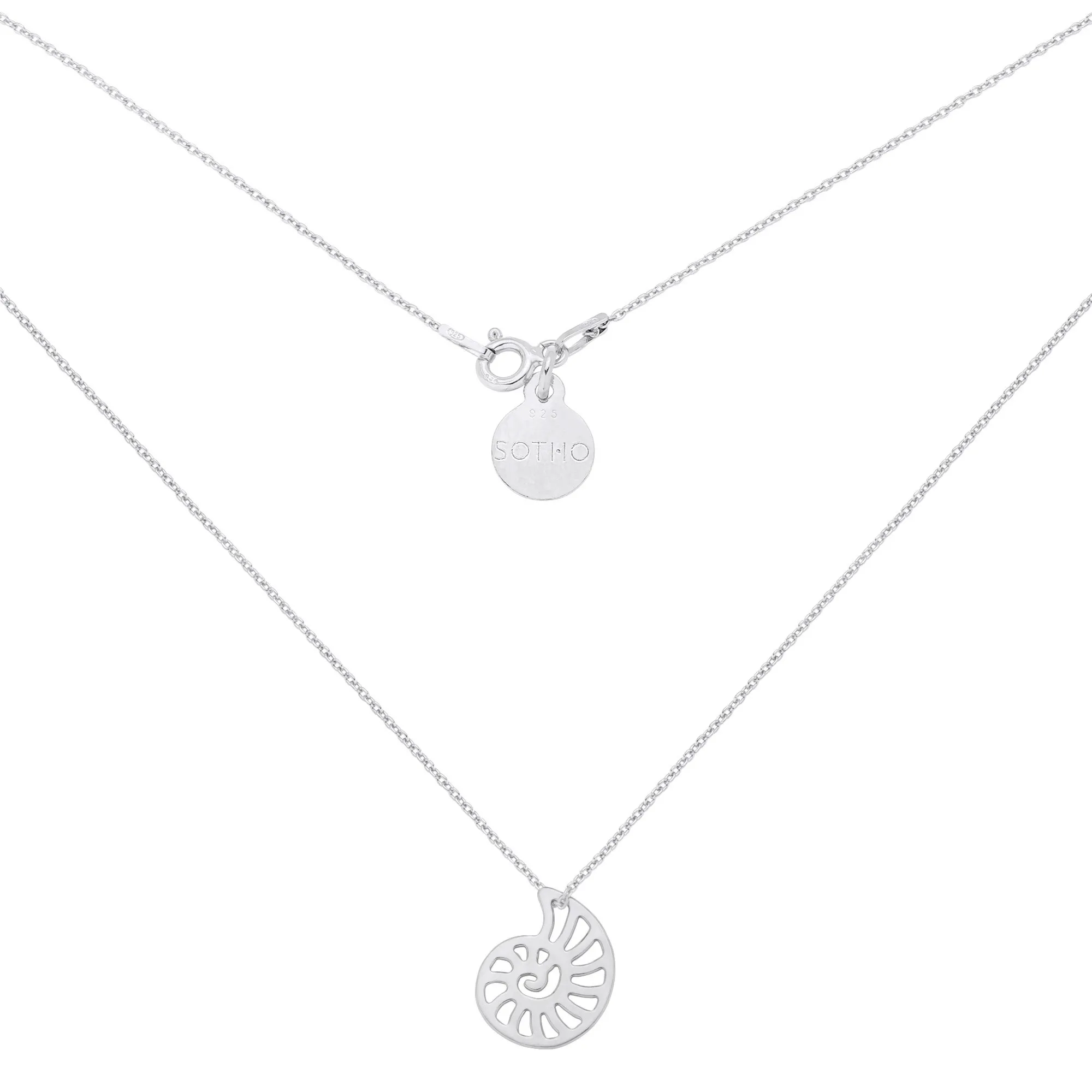 Srebry naszyjnik łańcuszkowy zdobiony ażurową muszelką i zawieszką z logo marki. Całość wykonana ze srebra 925. Długość łańcuszka do wyboru 38,40,45,50,60 lub 70cm Grubość łańcuszka 1 mm. Muszelka 15 x 12,5 mm. Zawieszka z logo 10 mm.