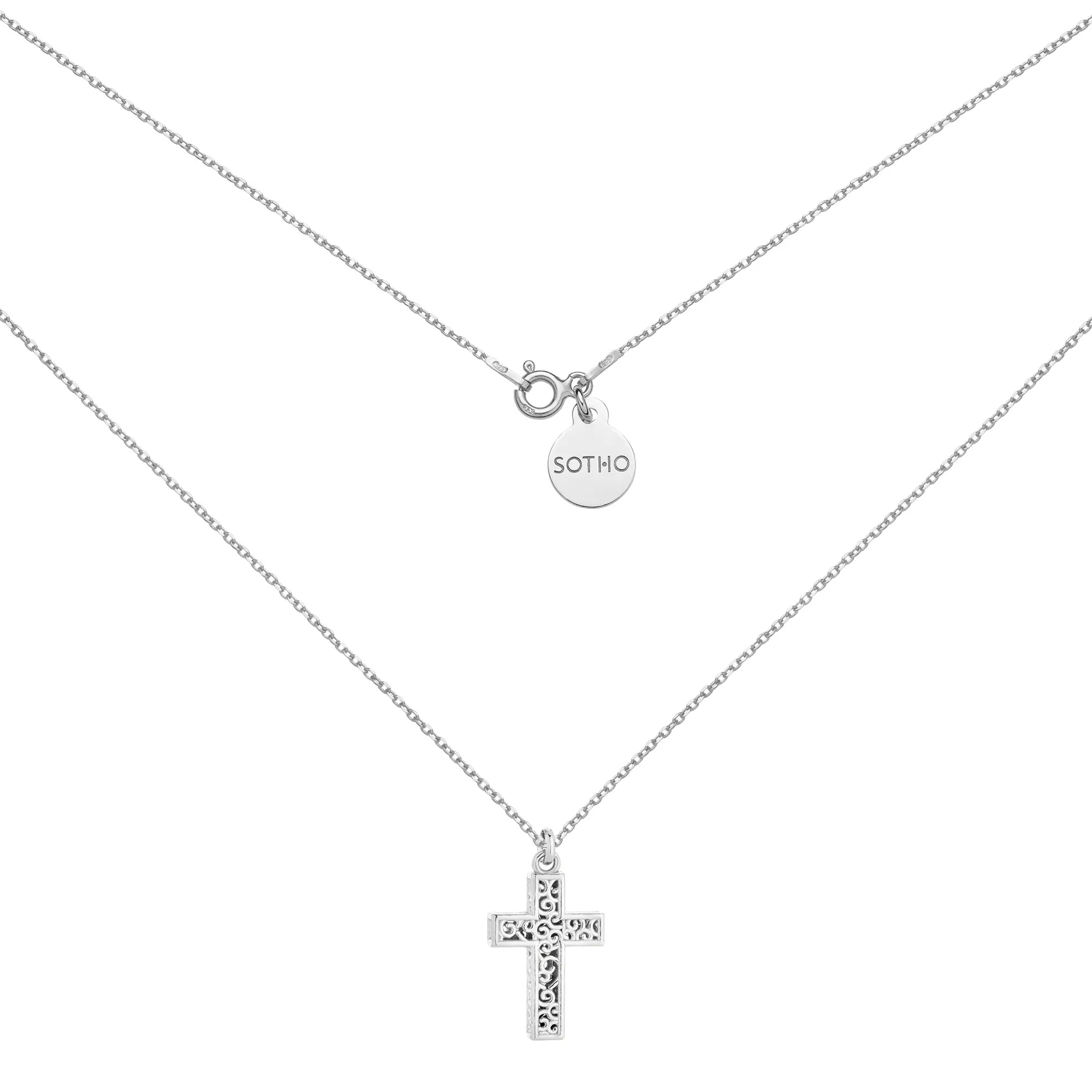 Srebrny naszyjnik łańcuszkowy zdobiony masywnym, ażurowym krzyżem i zawieszką z logo marki. Całość wykonana ze srebra 925. Długość naszyjnika do wyboru 38, 40, 45, 50, 60 lub 70cm Grubość łańcuszka 1 mm Krzyż 18 x 10 mm Zawieszka z logo 10 mm Produkt o wadze poniżej 5 g. Zapakowany w eleganckie pudełeczko z logo marki. Posiada logowaną metkę. Istnieje możliwość zamówienia naszyjnika z innym modelem zawieszki, z kilkoma zawieszkami, na innym modelu łańcuszka, w wersji ze srebra 925 powlekanego 24 karatowym żółtym lub różowym złotem, z dodatkowymi kamieniami, perłami lub kryształami SWAROVSKI® CRYSTAL itp.