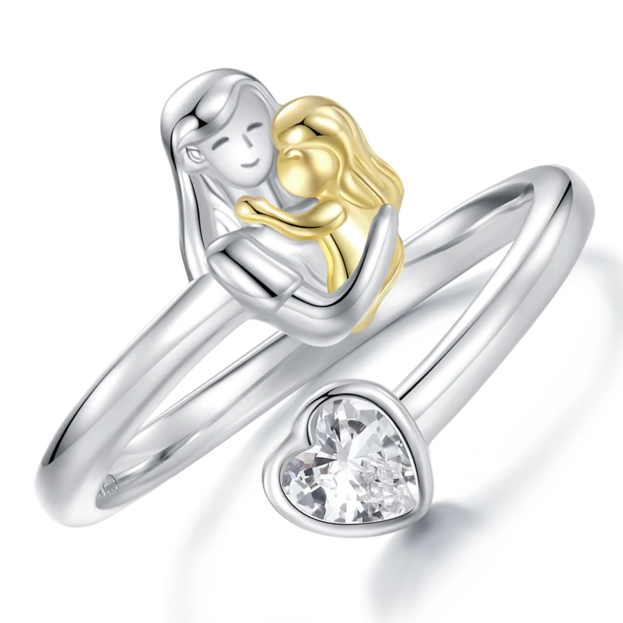 Srebrny pierścionek regulowany mama z dzieckiem i kryształowym sercem srebro 925