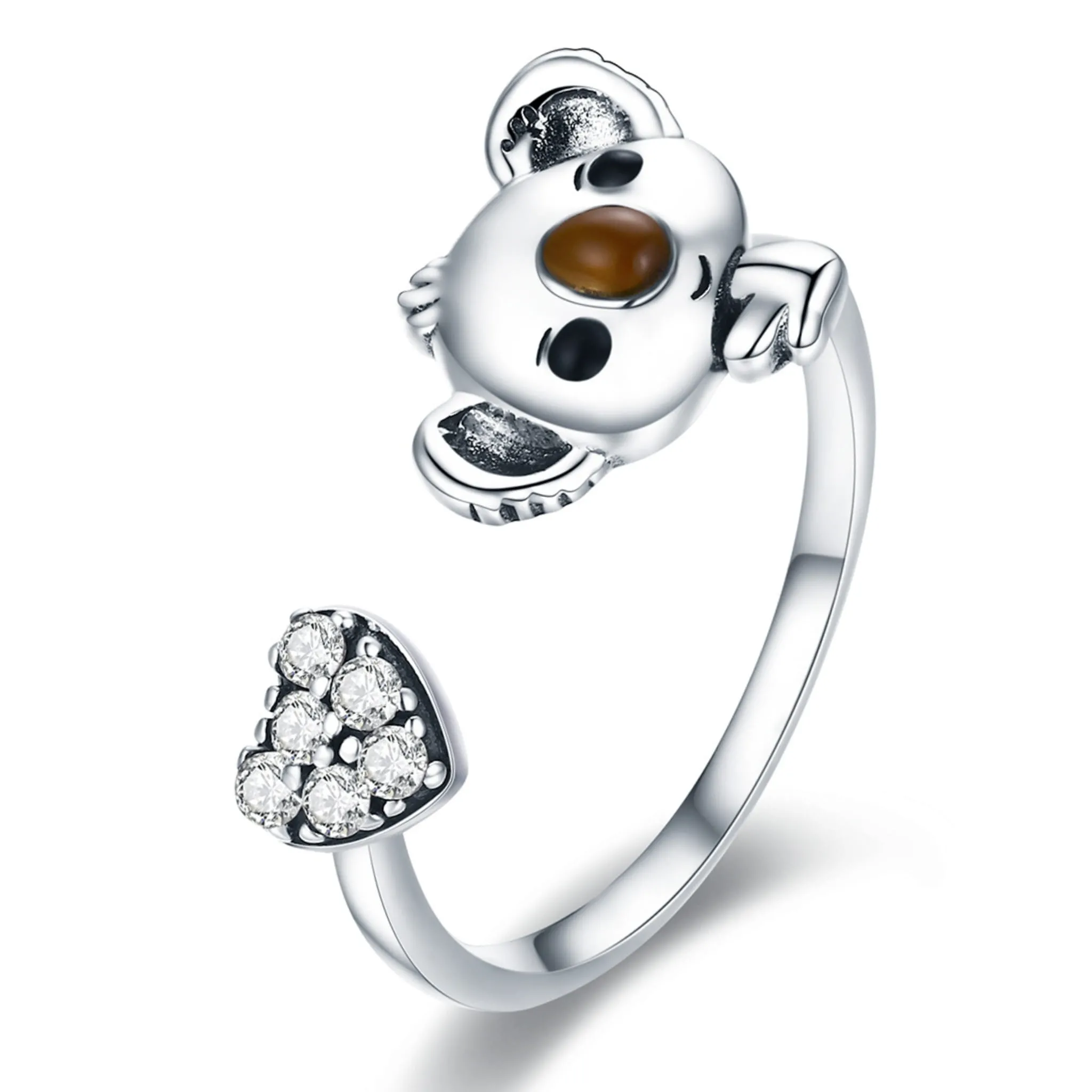 Srebrny pierścionek uniwersalny z koalą i kryształowym sercem srebro 925