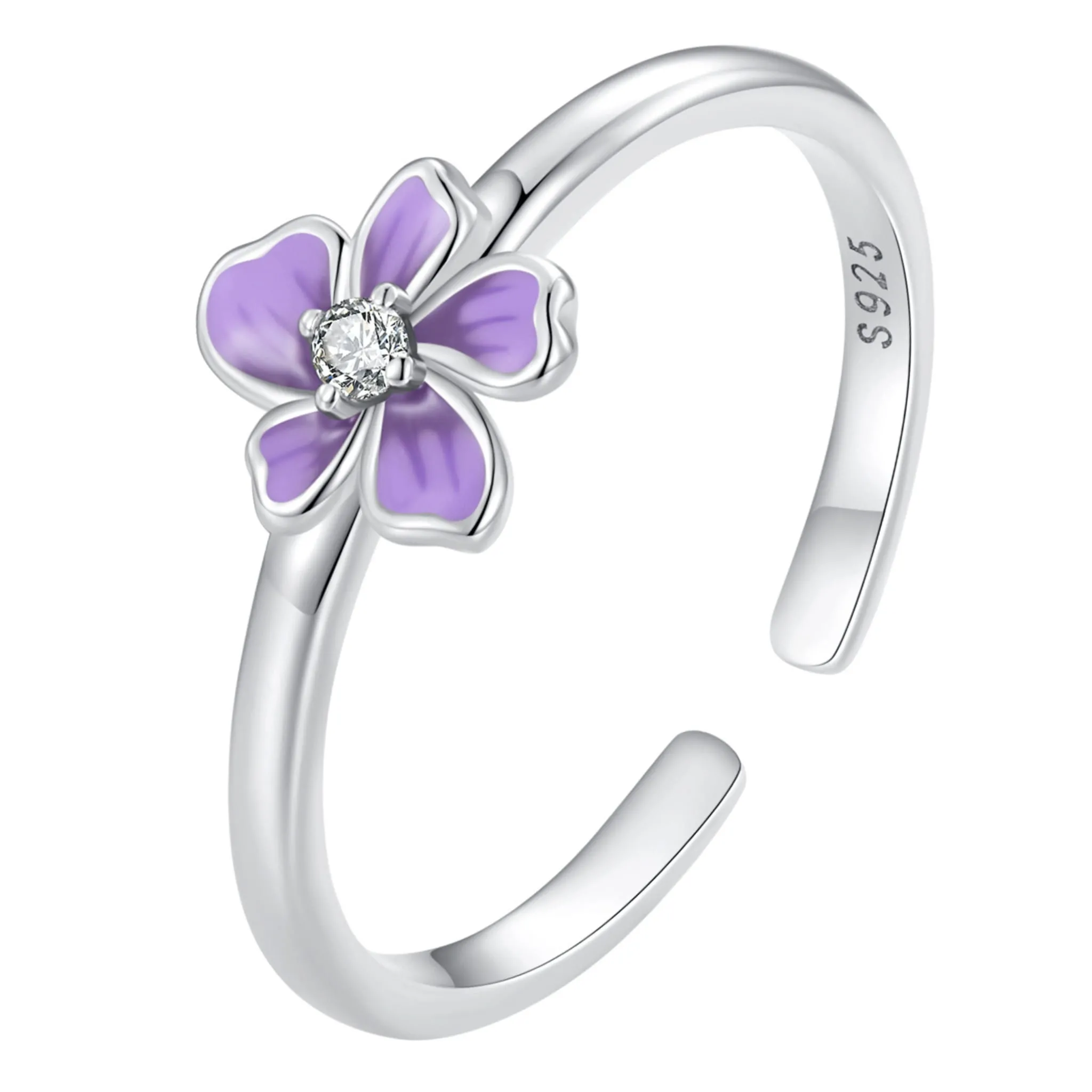 Srebrny pierścionek uniwersalny z fioletowym kwiatkiem srebro 925
