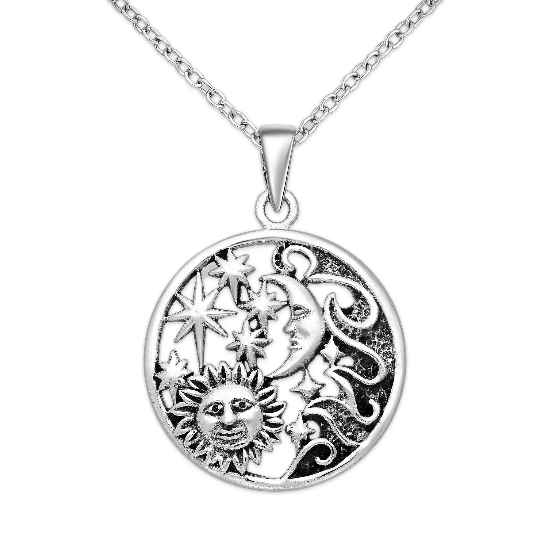 Srebrny Wisiorek Słońce Księżyc Wisiorek przedstawiający symbol słońca oraz księżyca. Wykonany w całości z delikatnie oksydowanego srebra próby 925. Zawieszka zrobiona bardzo starannie, z dbałością o najmniejsze detale.