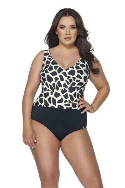 Jednoczęściowy kostium kąpielowy- klasyczny krój- górna część zdobiona egzotycznym printem- na piersiach delikatnie marszczony- czarny dół odcięty powyżej bioder nadaje figurze lekkości i optycznie ją wyszczupla- miseczki typu kopa, bez fiszbin- szerokie ramiączka Skład: 80% poliamid, 20% elastan…