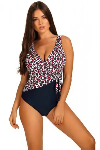 Kostium kąpielowy dwuczęściowy- biustonosz na fiszbinach, miseczki usztywnione- rozmiar 38 C i 40C dodatkowa gąbeczka push-up- ramiączka nieodpinane, regulowane- obwód zapinany na metalowy klips- do kompletu figi pełne figi- przy pasie ozdobne przewiązanie z siateczki Skład: 85% poliamid, 15% elastan…