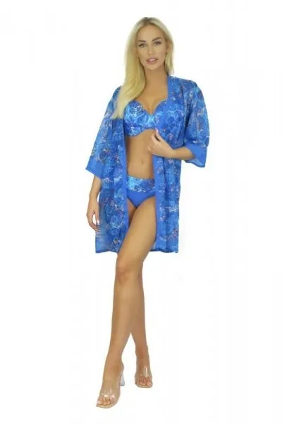 Kostium kąpielowy dwuczęściowy- miseczki usztywniane, na fiszbinach- dzianina w kolorowy print- ramiączka nieodpinane, regulowane- obwód zapinany na metalowy klips- do kompletu figi w jednolitym kolorze- przy nogawce wyżej podcięte- szerszy pas Skład: 85% poliamid, 15% elastan…