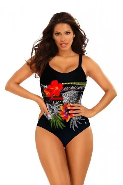 Kostium jednoczęściowy damski- z wysokiej jakości mikrofibry- miseczki usztywnione, bez fiszbin- od wewnętrznej strony, pod linią biustu wszyta guma podtrzymująca- łączenie miseczek zdobione elementem biżuteryjnym- ramiączka odpinane, regulowane- przód zdobiony wstawkami siateczki Skład: 78% poliamid, 22% elastan…
