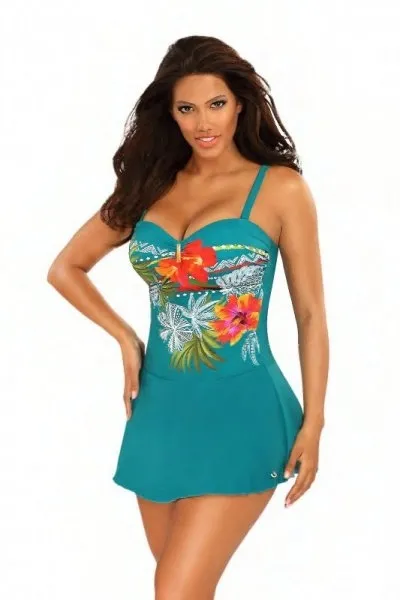 Modny i niezwykle elegancki strój kąpielowy renomowanego producenta.Atrakcyjny jednoczęściowy kostium kąpielowy o fasonie sukienki połączony z figami.Model zachwyca perfekcyjnym wykonaniem.Efektowne detale tworzą niepowtarzalny styl.Wspaniała propozycja dla eleganckiej kobiety, która ceni klasykę i wygodę.Usztywnione wyprofilowane miseczki push-up bez fiszbin, które dobrze kształtują i utrzymują biust pięknie go powiększając (miski formowane termicznie, wkładki nie są wyjmowane).Strój posiada dodatkowo boczne fiszbiny i elastyczną taśmę pod biustem, co pozwala lepiej trzymać biust.Między miseczkami delikatne marszczenie i ozdoba w kolorze złotym.Ramiączka regulowane i odpinane.Uroku dodaje delikatna siateczka, która dzięki skośnemu ułożeniu optycznie wyszczupla sylwetkę.Tył gładki, figi pełne klasyczne.Kostium od wewnątrz pokryty jest delikatną podszewką, dzięki czemu można czuć się swobodnie, ponieważ strój nie prześwituje.Idealnie sprawdzi się zarówno na basenie jak i plaży.Materiał odporny na chlor, wodę morską i słońce.Strój kąpielowy wykonany z wysokiej jakości tkaniny, zapewniającej wysoki komfort noszenia.Skład materiału: 78% poliamid, 22% elastan…