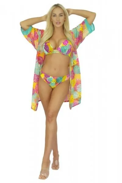 Kostium kąpielowy dwuczęściowy- biustonosz bez fiszbin, w dolnej części miseczek push-up termicznie formowany- miseczki trójkątne- wiązany na szyi i w obwodzie- figi o klasycznym kroju, podwójna dzianina Skład: 85% poliamid, 15% elastan…