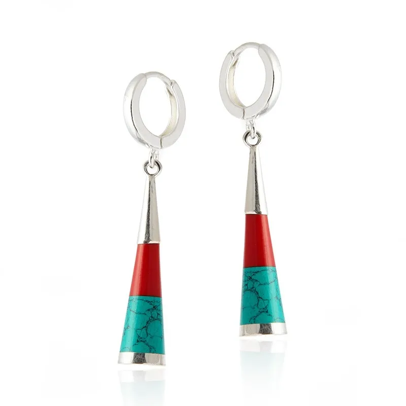Kolczyki srebrne z turkusem i koralem w kształcie stożka „płomień azteków”