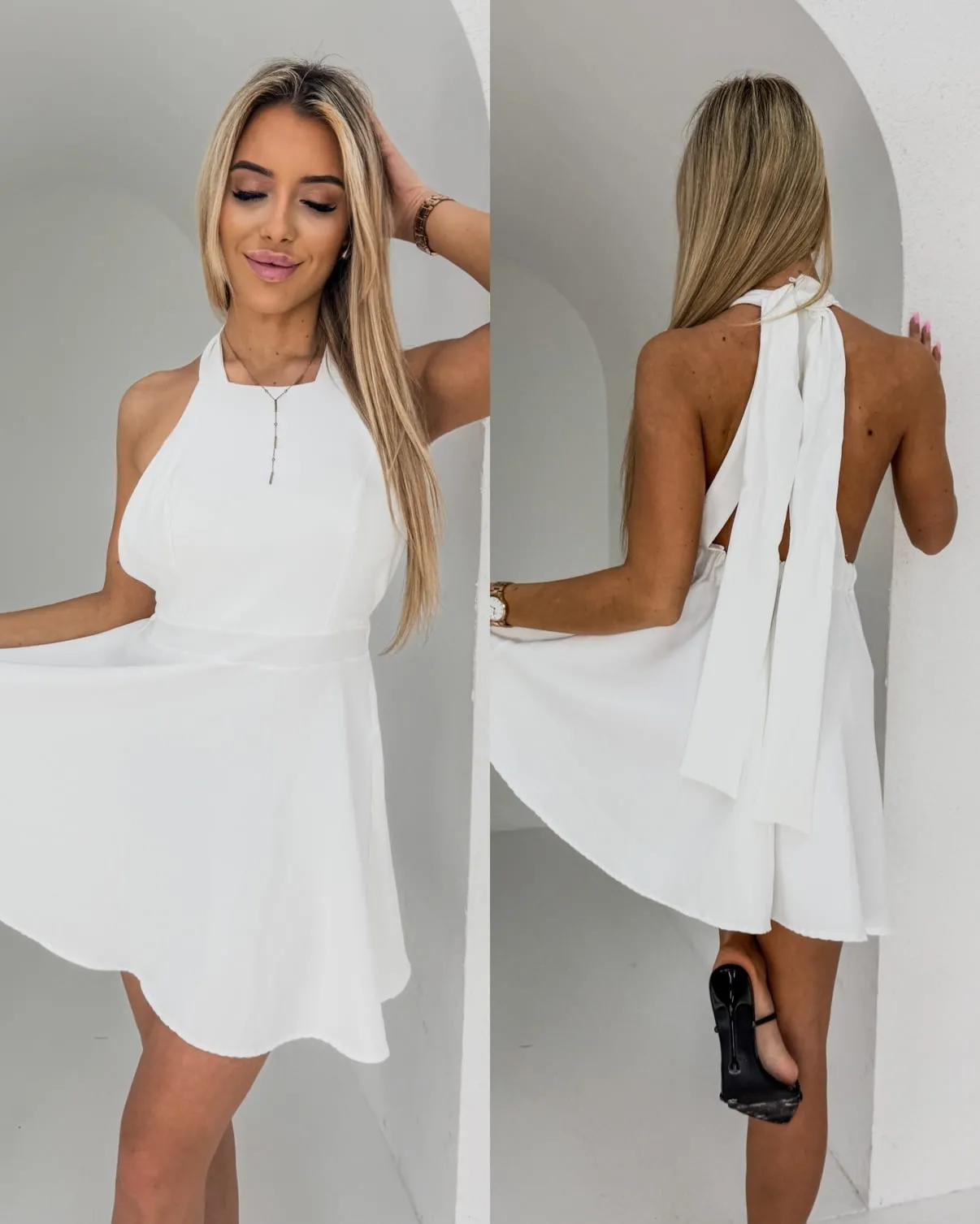 Sukienka z wiązaniem na szyi ecru Tiffany W6 (Wariant rozmiar + kolor: Uniwersalny; Kolor: Kremowy/Ecru)