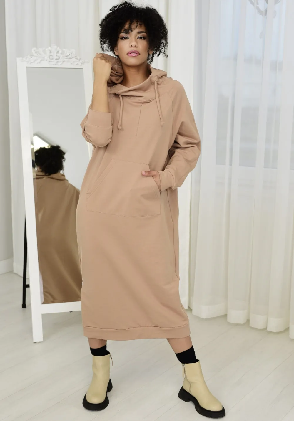 Prosta sukienka dresowa w subtelnym kolorze beżowym. Uszyta została z przewiewnej bawełny, która ma pod spodem miękki meszek. Wygodny, sportowy fason sprawi, że poczujesz się komfortowo. Jasna sukienka sięga do połowy łydki. Dobierz do niej ulubione adidasy lub zamszowe półbuty i ciesz się nietuzinkowym lookiem. SKŁAD 92 COTTON , 8 ELASTAN WYMIARY SUKIENKI XS/S M/L XL/XXL 1/2 BIUST 57 61 65 1/2 TALIA 58 62 66 1/2 BIODRA 58 62 66 RĘKAW 63 64 65 DŁUGOŚĆ 111 112 113 WYMIARY CIAŁA XS S M L XL XXL BIUST 82-85 86-89 90-93 94-97 98-101 102-105 TALIA 66-69 70-73 74-77 78-81 82-85 86-89 BIODRA 92-95 96-99 100-103 104-107 108-111 112-115