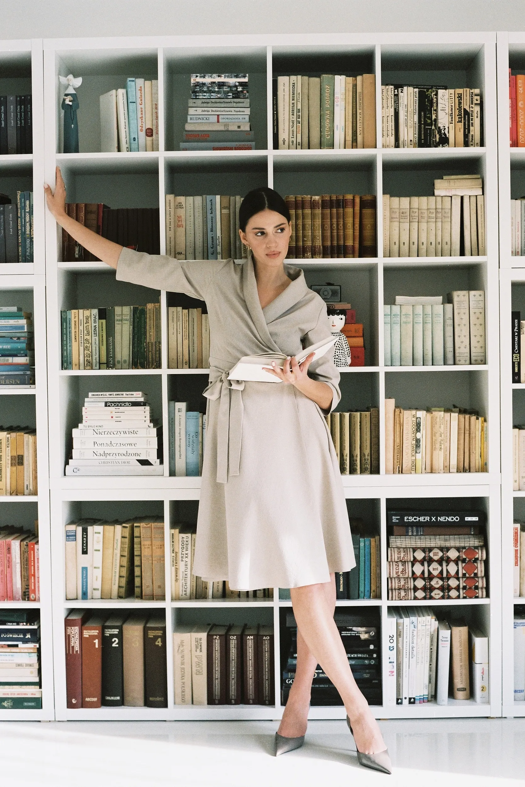 Sukienka o Kopertowym Kroju z Szalowym Kołnierzem - Beżowa