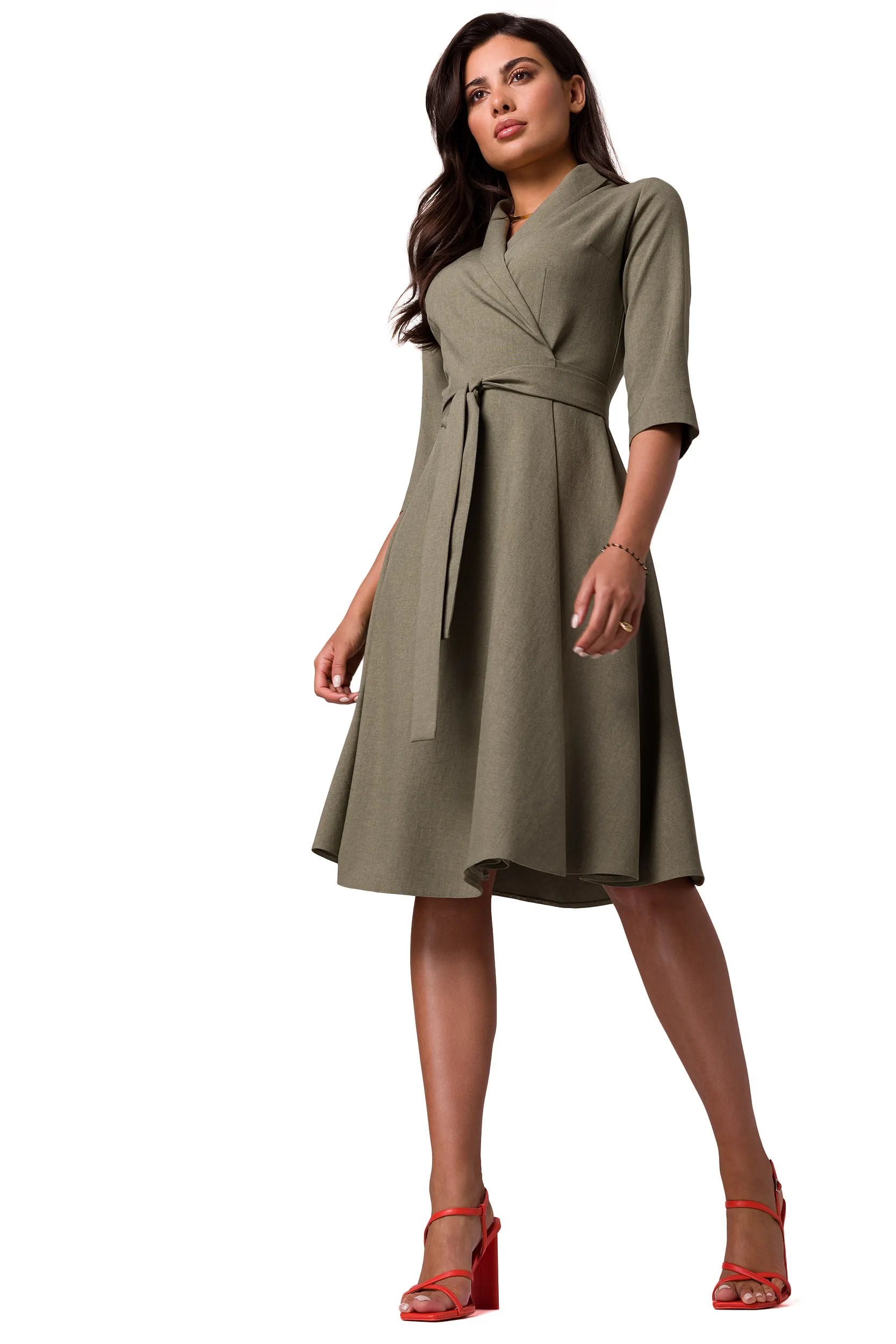 Sukienka o Kopertowym Kroju z Szalowym Kołnierzem - Oliwkowa