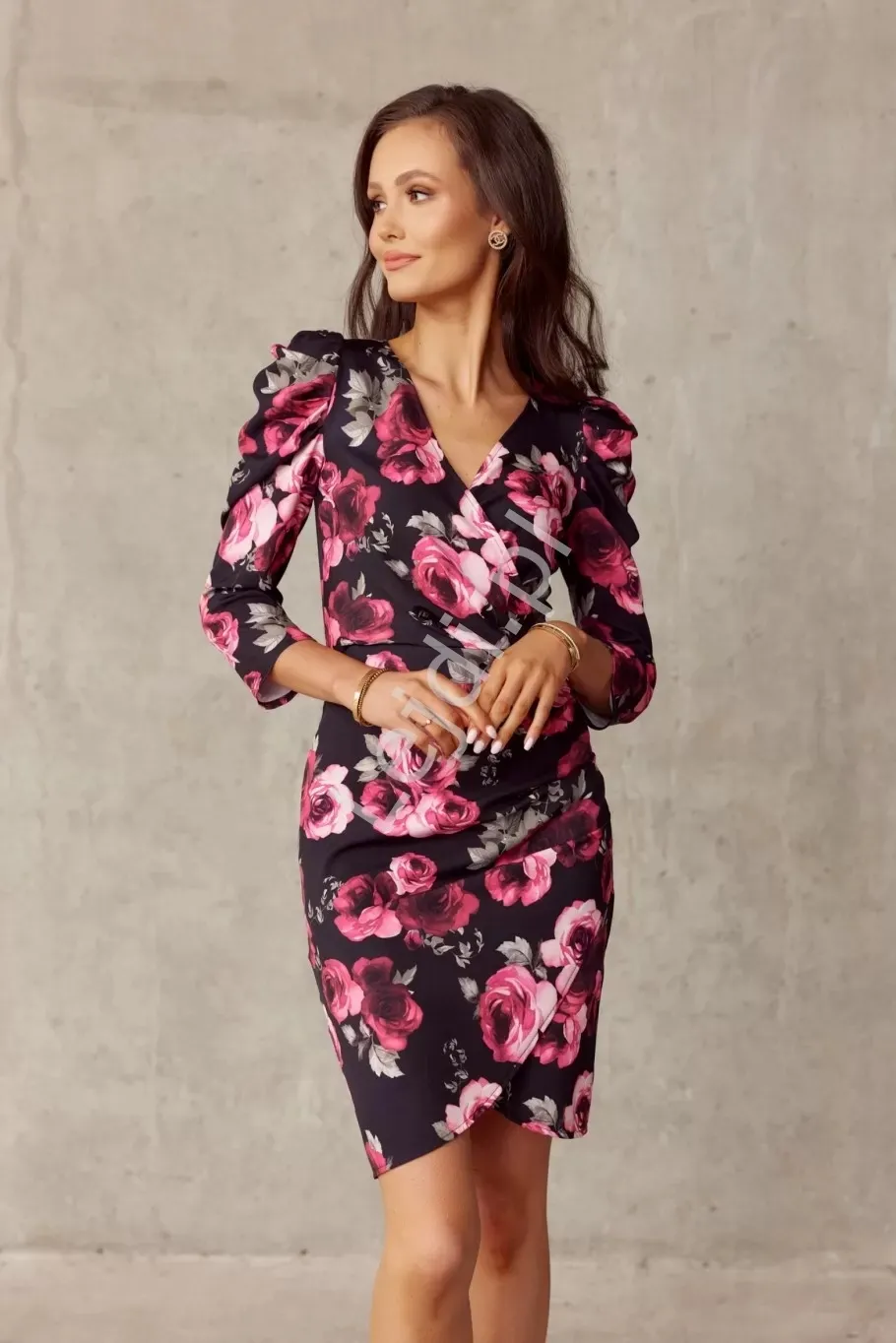Sukienka City Blooms w kwiaty. Sukienka ołówkowa z dekoltem kopertowym. Sukienka w nadrukowane róże w kolorze fuksjowym. Sukienka ma mankiety na bufiastych rękawach.