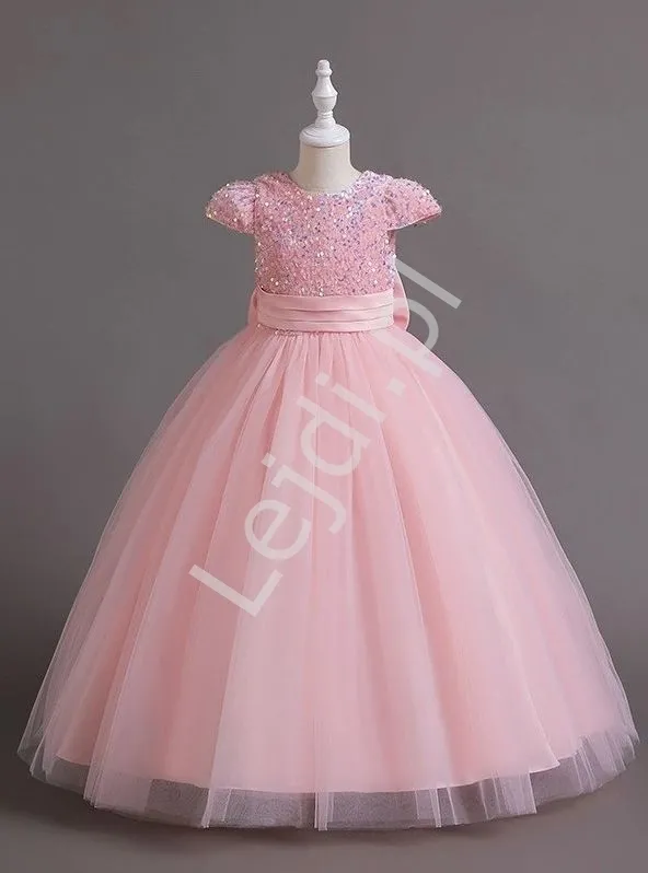 Sukienka wieczorowa dla dziewczynki z cekinami i tiulowym dołem jasno rózowa C320