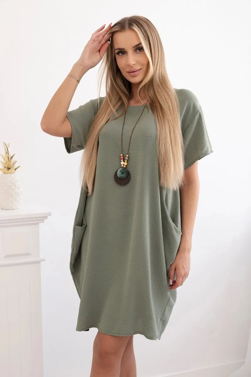 Sukienka z kieszeniami i wisiorkiem jasne khaki