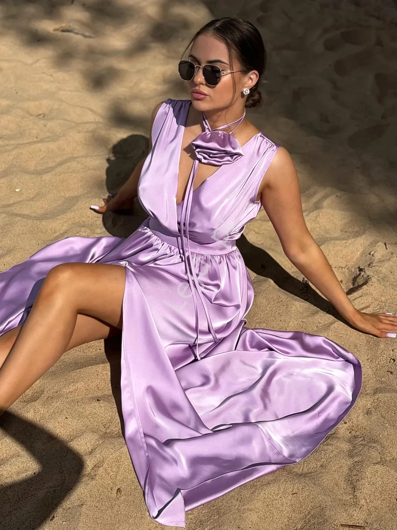 Sukienka brokatowa z różą na ramieniu. Długa suknia wieczorowa, która olśniewa swoim blaskiem. Sukienka w kolorze niebieskiego z poświata fuksjową.