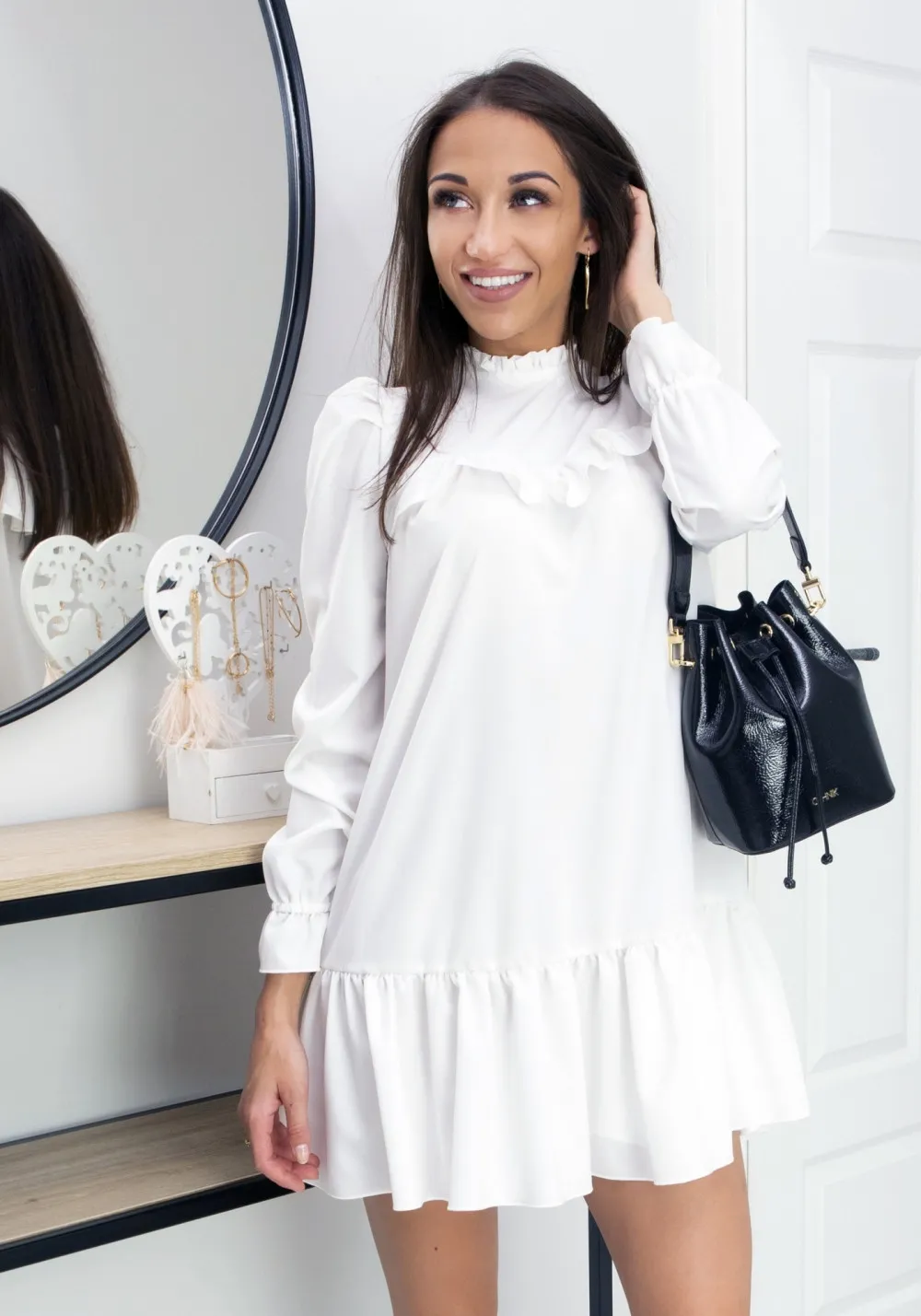Casualowa sukienka oversizowa w dobrym stylu. Prosty krój urozmaicają efektowne falbany. To model idealny na chłodniejsze miesiące. Biała sukienka ma długi rękaw i spódniczkę sięgającą do połowy uda. Sprzedajemy ją w kilku rozmiarach – od XS do L. Wybierz odpowiedni, a oversize będzie prezentował się naprawdę efektownie. Skład: 95 poliester, 5% elastan