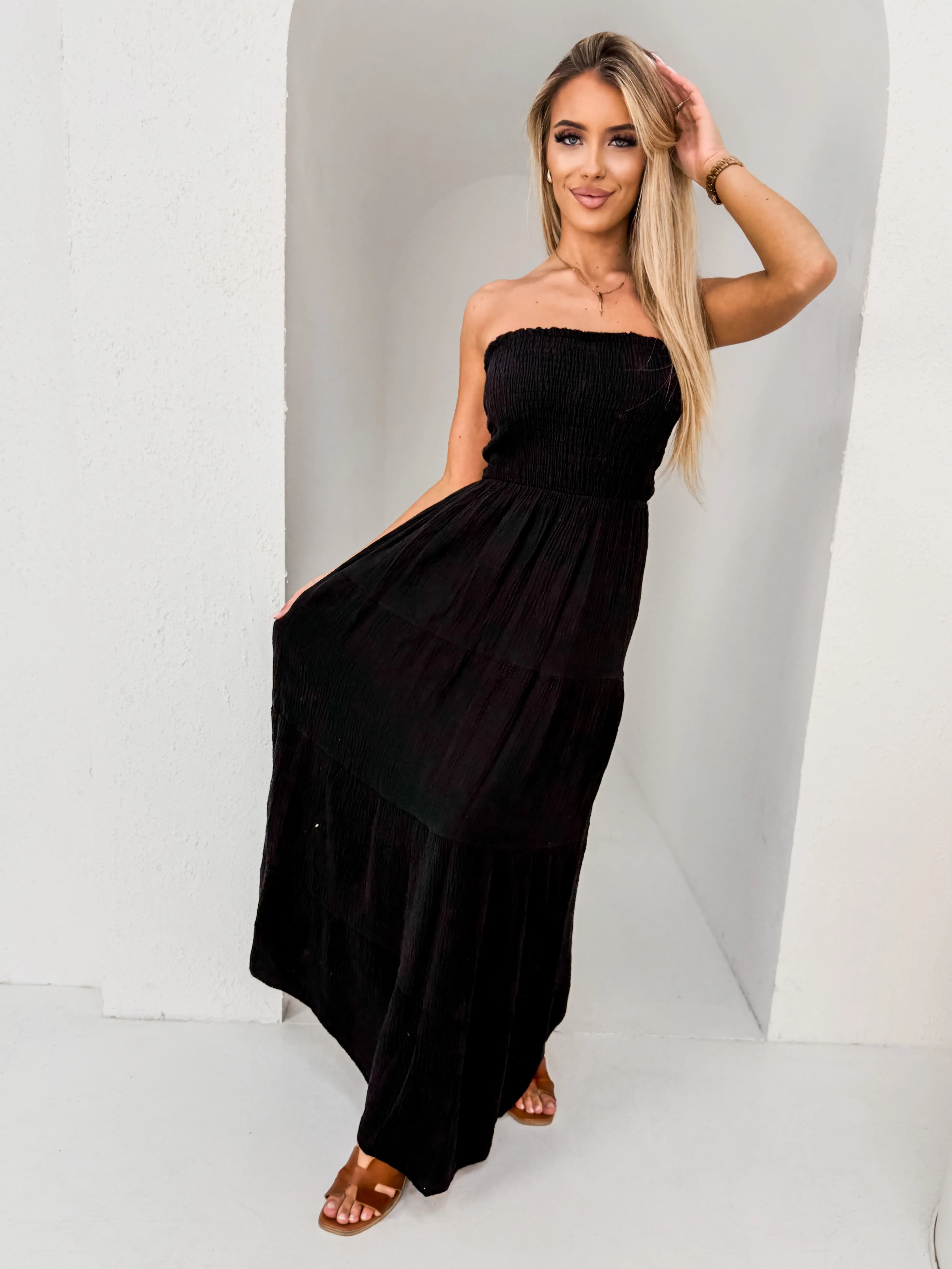 Sukienka bardotka maxi muślinowa czarna Holly KPW4 (Wariant rozmiar + kolor: Uniwersalny; Kolor: czarny)