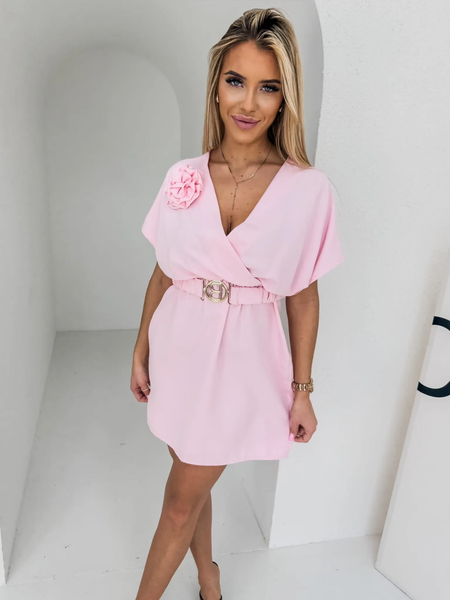 79,00 złSukienka z wiązanym kwiatkiem różowa z krótkim rękawem Stacy PW2 (Wariant rozmiar + kolor: Uniwersalny; Kolor: Różowy)