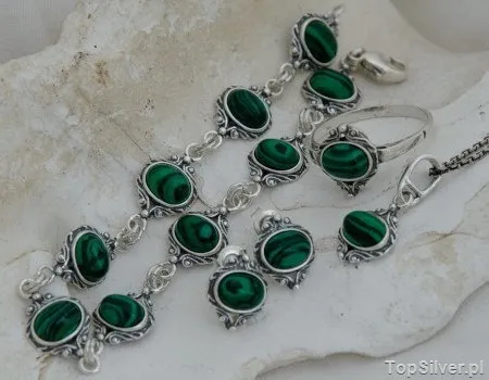 W inspirowane motywami roślinnymi srebrne oprawki, zakute zostały korale (synt). W skład takiego zestawu wchodzą: bransoletka, kolczyki, wisior oraz pierścionek. Wymiary pojedyńczego ogniwa to: 11mm x 13mm Wymiar kamienia to: 6 x 8mm Srebro próby 925.