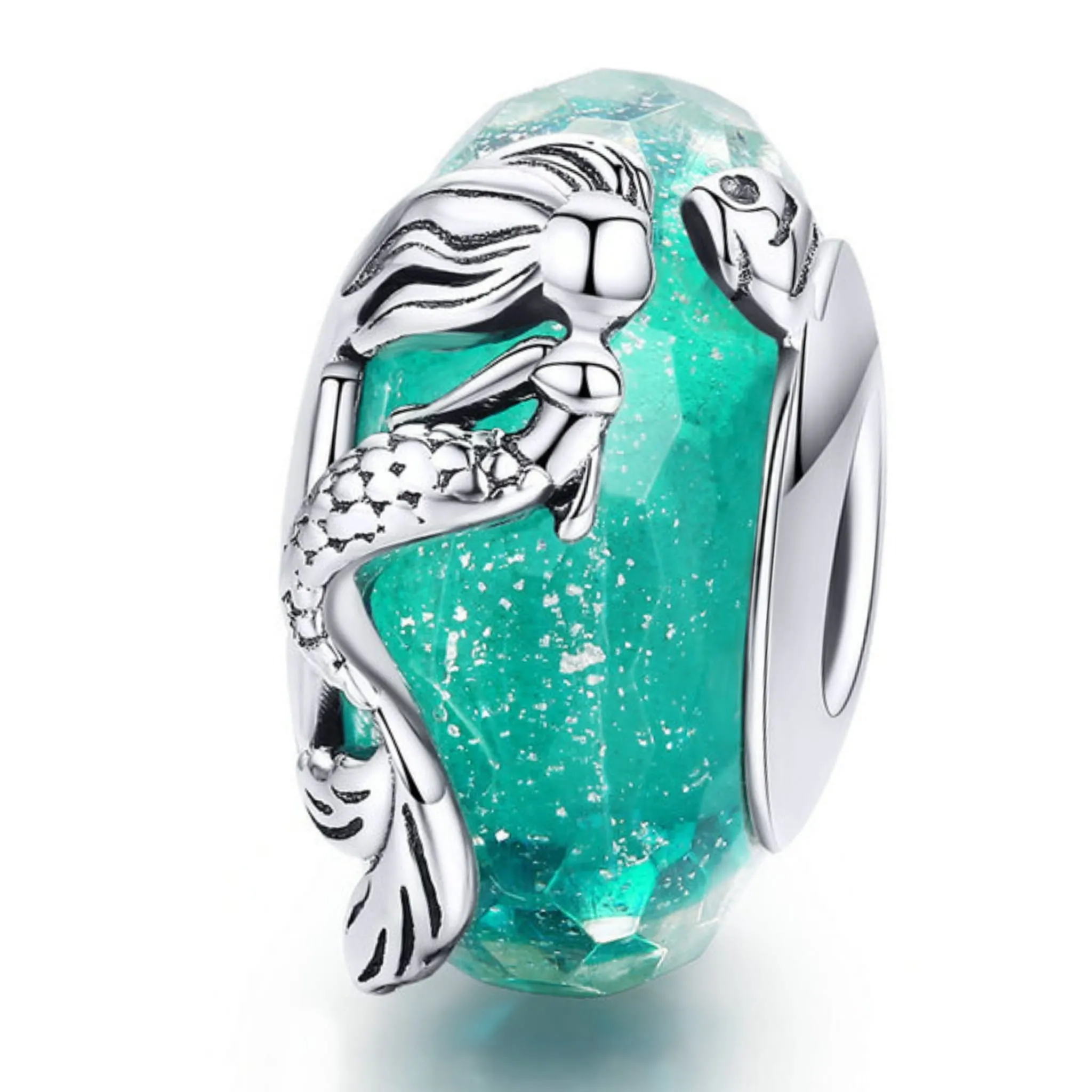 Zielony szklany charms ze srebrnymi syrenkami srebro 925 beads