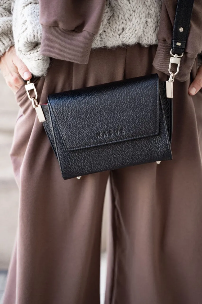 Torebka Nashe SWITCH MAXI jest: wielofunkcyjna: noś na ukos, crossbody, lub na ramieniu uszyta z naturalnej skóry groszkowej najwyższej jakości stworzona według autorskiego projektu wykonana w polskiej pracowni z miłością, pasją i w zgodnie ze sztuką kaletniczą wyposażona w DWA doczepiane, regulowane paski: pasek o szerokości 5cm i długość 84 – 94cm pasek o szerokości 3cm i długości 112 – 127cm wykończona odpornymi na zarysowania metalowymi okuciami zabezpieczona chroniącymi przed zarysowaniami skóry od spodu metalowymi nóżkami zapinana na trwałe magnesy kryte wyłożona elegancką czerwoną lub czarną podszewką z delikatnym satynowym połyskiem funkcjonalna – 2 kieszenie: otwarta naszywana + zamykana na suwak, na dokumenty lub karty zapakowana w wytrzymały worek przeciwkurzowy wymiary: 26 (szerokość na górze na wysokości bocznych uchwytów) / 20 (szerokość na dole torebki) × 16 × 6 cm | nie mieści A5 waga: 0.7 kg Co znajduje się w pudełku?