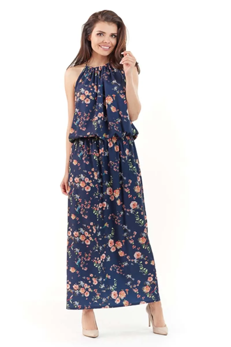 Długa Letnia Granatowa Sukienka w Kwiatki wiązana na Karku